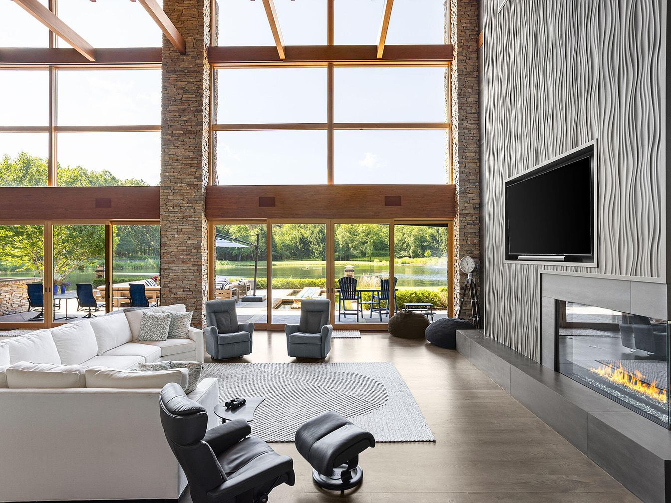 This expansive living room features floor-to-ceiling windows framed in warm wood that flood the space with natural light and offer breathtaking views of a serene lake and lush greenery outside. The focal point is a striking textured accent wall in a wave pattern, accommodating a sleek flat-screen TV above a modern linear fireplace with a stone surround that adds warmth and sophistication. Furnished with a large white sectional, cozy gray armchairs, and a black leather recliner with ottoman, the room balances comfort with style. Neutral tones and natural textures create a calm, inviting ambiance. The high ceiling with exposed wooden beams and light wood flooring completes the airy, contemporary design.