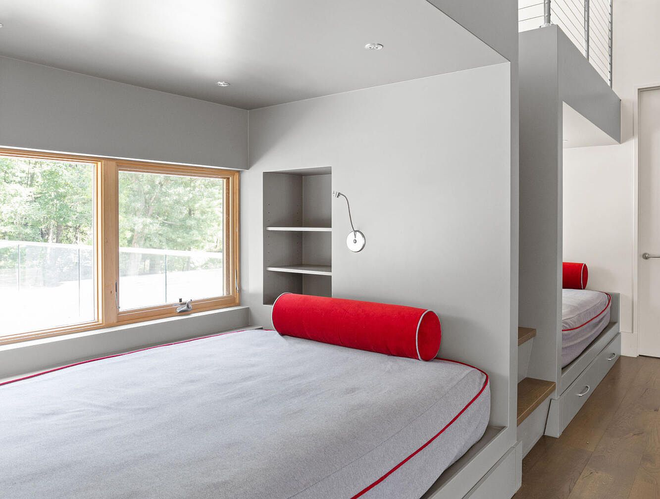 This compact bunk bedroom features a sleek, minimalist design with a neutral color palette dominated by soft gray walls and bedding accented with bold red cylindrical pillows. Custom built-in beds are integrated into the wall structure, separated by a narrow set of wooden steps, maximizing floor space. Each bed includes under-bed drawers for additional storage, while recessed shelves provide functional nooks for personal items. Large wooden-framed windows fill the room with natural light, offering serene views of greenery outside. The overall aesthetic balances modern simplicity with thoughtful practical elements, creating an inviting yet efficient sleeping area.