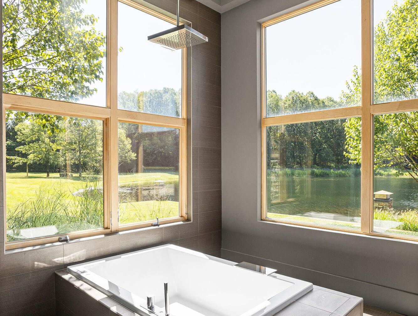 This bathroom features a spacious, modern bathtub positioned adjacent to large floor-to-ceiling windows with natural wood frames, allowing an expansive view of the lush greenery and serene water outside. The walls are finished with sleek gray tiles, contributing to a calm and neutral color palette. A contemporary square showerhead is mounted above the tub area, adding to the minimalist design. The natural light floods the space, enhancing the tranquil ambiance and creating a harmonious connection between indoor comfort and the outdoor landscape, perfect for relaxation and rejuvenation.