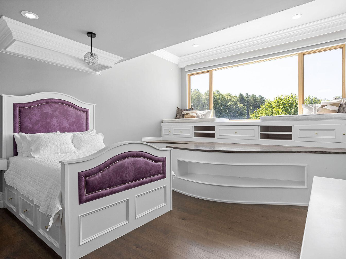 This serene bedroom features a striking bed with a white wooden frame accented by upholstered panels in a rich purple shade, blending elegance with comfort. Crisp white bedding contrasts gently against the purple while adding brightness. The room opens up to a large corner window seating nook framed by cabinetry, offering ample storage and a perfect spot to relax while enjoying views of lush greenery outside. Light gray walls complement the white trim and crown molding, enhancing the room’s airy feel. Dark hardwood floors ground the space, adding warmth and balance to the clean, classic design.