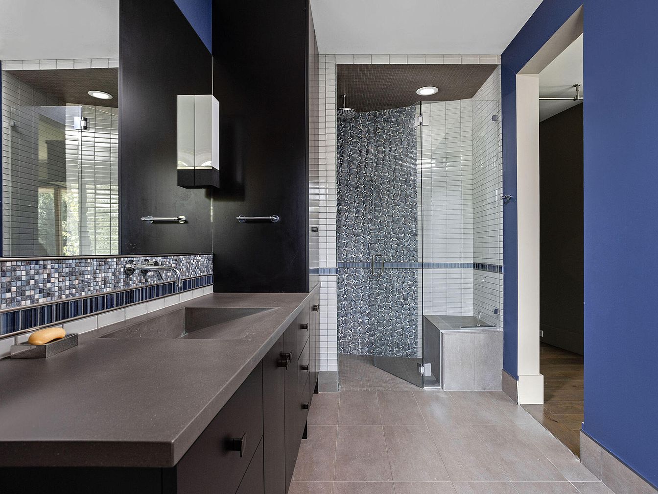 This bathroom features a sleek, minimalist design with a rich color palette dominated by dark cabinets and deep blue walls. The vanity is long, with a solid surface countertop and an integrated sink, complemented by modern, wall-mounted faucets. Above the sink, a large mirror with a mosaic tile border adds texture and a pop of color that coordinates with the shower tiles. The walk-in shower showcases a glass door with mosaic tiles on the back wall, creating a focal point that contrasts elegantly with the white subway tiles surrounding it. The floor is tiled in a neutral tone, unifying the space with subtle warmth.