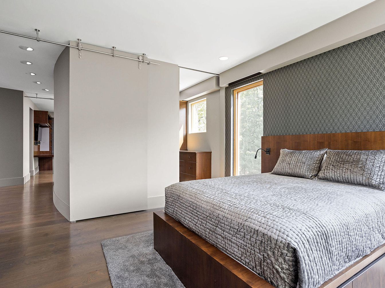 This master bedroom combines a sophisticated palette of soft grays and rich wood tones. A plush gray bedspread and pillows sit atop a modern wooden platform bed with a matching headboard. The accent wall behind the bed features a subtle geometric pattern, adding texture without overwhelming the tranquil space. Natural light filters through large windows framed with warm wood, brightening the room’s smooth hardwood floors. A curved sliding door leads to a concealed storage or closet area furnished with dark wood drawers, seamlessly integrating functionality with clean, contemporary design.