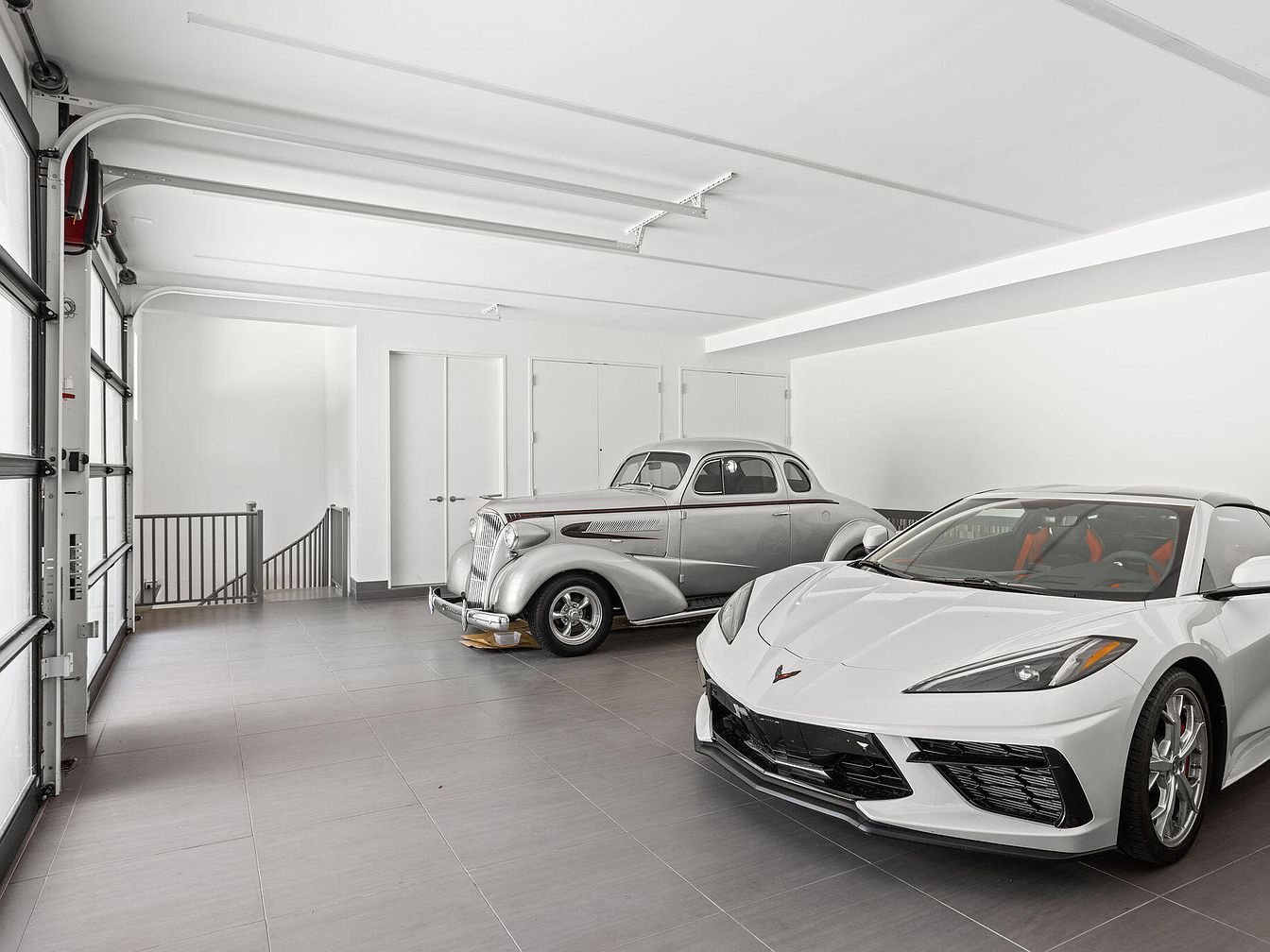 This garage combines elegance with functionality, featuring a clean, minimalist design highlighted by smooth gray floor tiles that add a contemporary touch. The walls and ceiling are painted bright white, enhancing the spacious feel and reflecting natural light that enters through large glass-paneled garage doors on one side. The space showcases two distinct cars: a sleek, modern white sports car with bold accents inside, and a classic vintage car, emphasizing a blend of old and new automotive passion. Built-in storage closets and a staircase with a simple metal railing provide subtle architectural interest without cluttering the open floor plan.