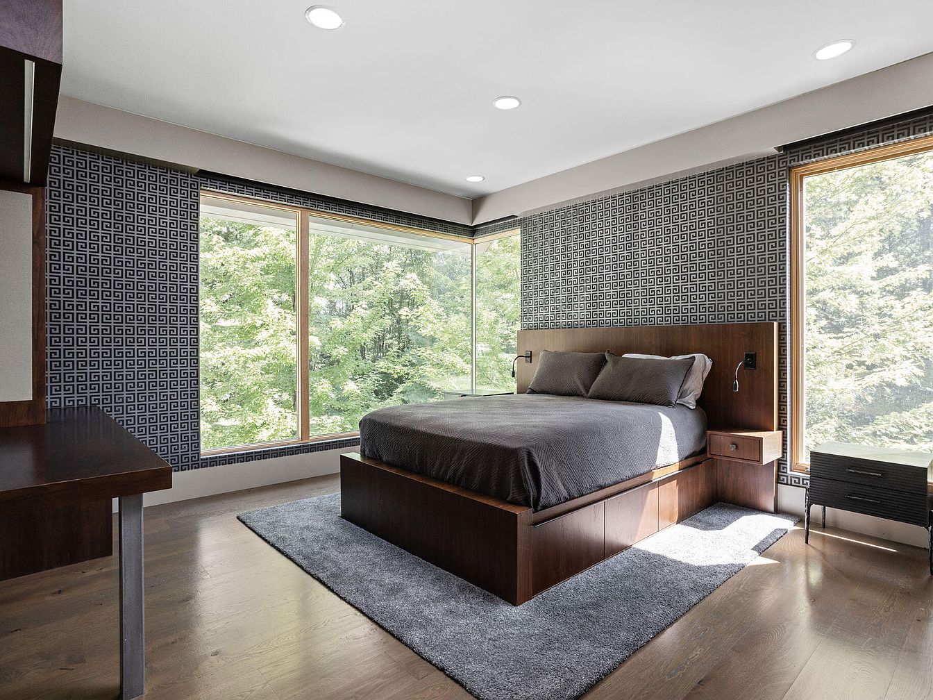 This bedroom features a striking corner window design that floods the space with natural light, offering expansive views of lush greenery outside. The color palette includes dark wood tones in the bed frame and furniture, complemented by a muted gray area rug and bedding. The walls boast a modern black-and-white geometric pattern, adding a bold, artistic flair that contrasts with the serene outdoor scenery. Recessed ceiling lights provide subtle illumination, while minimalist nightstands and understated wall-mounted reading lamps maintain a clean, uncluttered aesthetic, blending nature and contemporary style effortlessly.