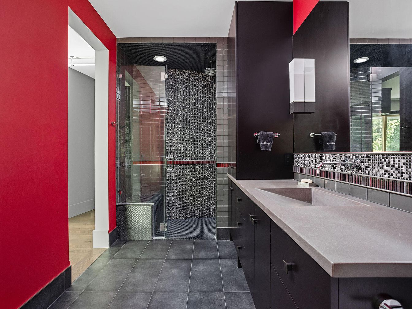 The master bathroom features a modern, dramatic aesthetic with bold red walls contrasting against sleek black cabinetry and dark gray floor tiles. The long countertop integrates a seamless sink, providing a streamlined and minimalist design. Above the sink, a large mirror reflects the striking mosaic tile backsplash that incorporates black, white, and red tones, tying the room’s color palette together. The spacious walk-in shower is enclosed with glass and lined with coordinating mosaic tiles, including a built-in bench, and accented with a rainfall showerhead. Overall, the space balances edgy color with functional luxury.