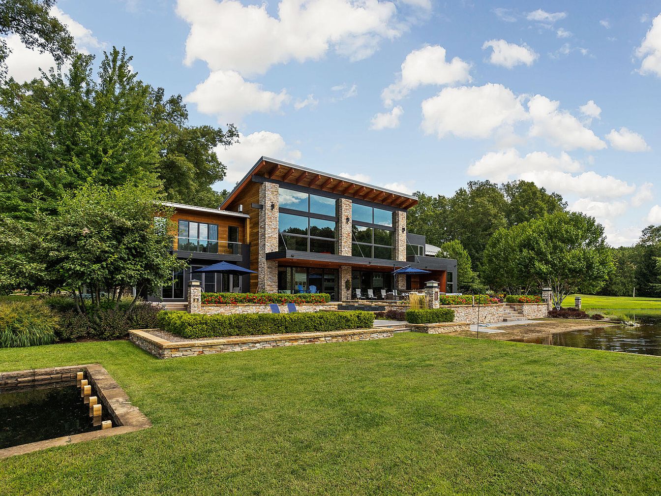This lakeside home boasts a contemporary design featuring large stone columns and expansive floor-to-ceiling windows that invite natural light and frame serene water views. The roofline has a subtle pitch with exposed wood beams adding architectural interest. The facade combines natural stone, wood accents, and dark metal trim to create a balanced and earthy yet modern palette. The outdoor terrace is neatly bordered by low stone walls with vibrant flower beds, offering a tranquil seating area shaded by two navy blue umbrellas. Lush green landscaping and mature trees surround the property, blending nature with sophisticated design.