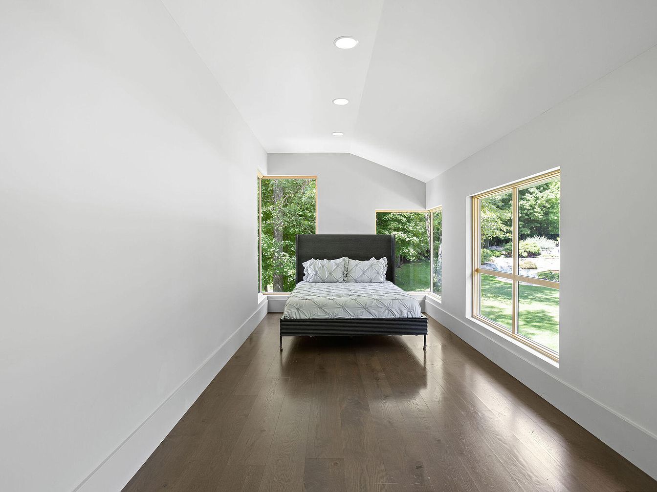 This streamlined bedroom emphasizes simplicity and natural light, featuring clean white walls that meet a sloped ceiling with recessed lighting. A dark-toned wooden bed frame with light gray, textured bedding stands centered at the far end, framed by large windows on three sides. These floor-to-ceiling windows offer expansive views of lush greenery outside, blending the interior with nature. The medium-toned hardwood floor adds warmth and contrasts with the crisp walls. The room’s design highlights open space, minimal furniture, and a serene, airy atmosphere, creating a modern retreat focused on light and tranquility.