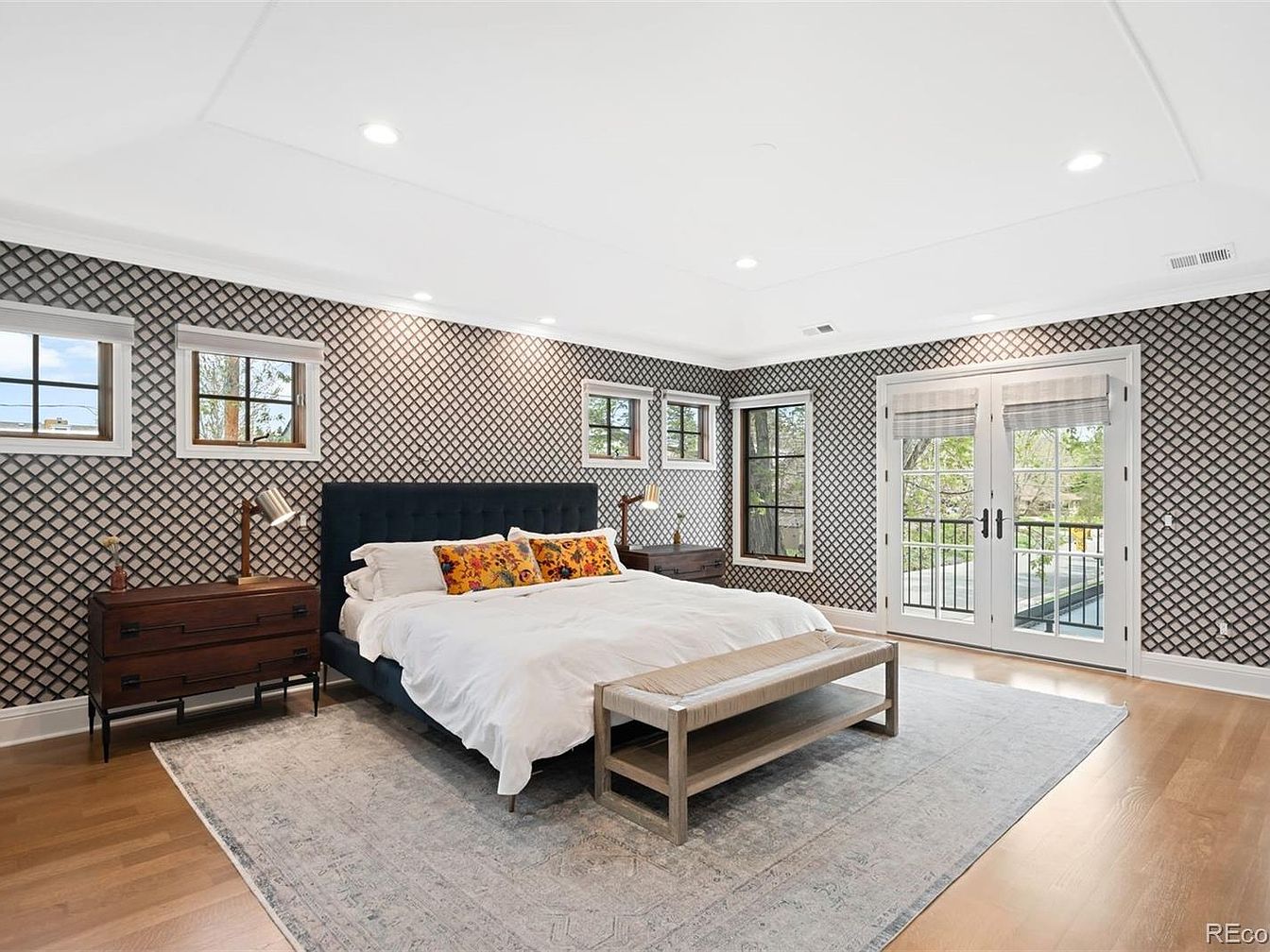 This spacious master bedroom features a striking accent wall with a geometric lattice pattern in neutral tones that adds texture and visual interest. The room is anchored by a large bed with a navy upholstered headboard, complemented by crisp white bedding and vibrant floral accent pillows for a pop of color. On either side of the bed, dark wood nightstands with sleek brass lamps provide functionality and style. Natural light fills the space through multiple windows and glass-paned French doors leading to an outdoor balcony, enhancing the airy and welcoming atmosphere. Light hardwood flooring and a large, patterned area rug complete the warm, elegant look.