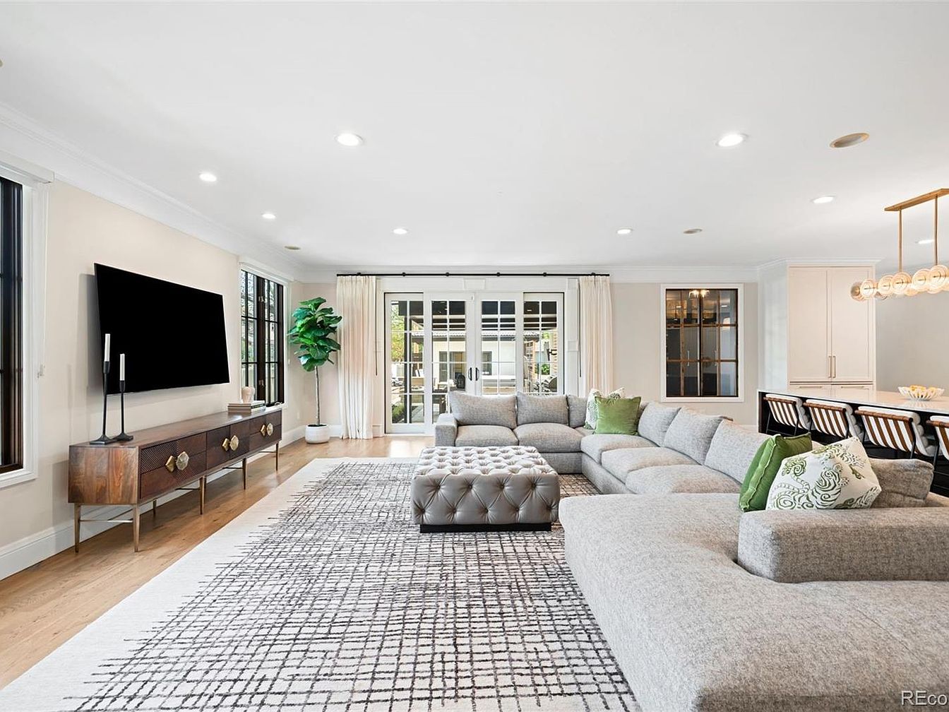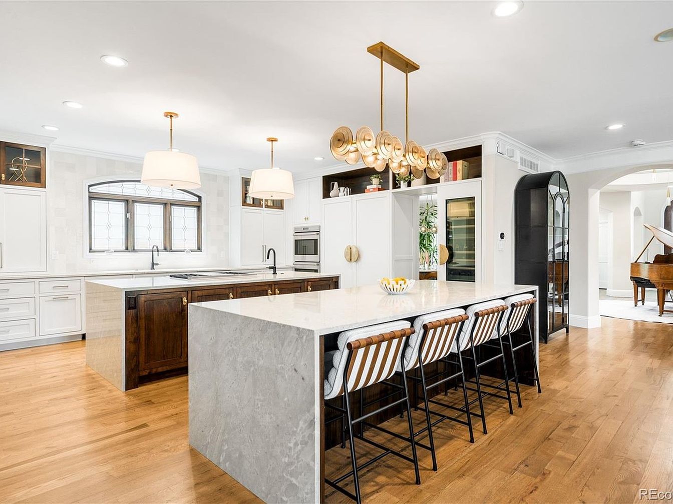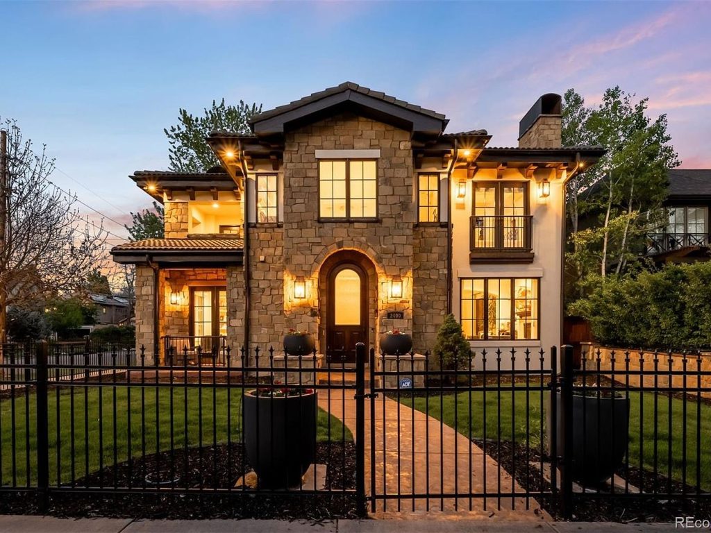 This stunning home, situated in the coveted Observatory Park neighborhood of Denver, Colorado, represents an exceptional example of modern luxury combined with classic architectural charm. The architectural style blends Mediterranean influences with contemporary design cues, evident in the stone façade, tiled roof, and elegant wrought iron fencing enclosing an oversized lot. The interior offers ample entertaining spaces, including a dedicated dining room with a built-in bar featuring dual wine fridges and custom lighting. The heart of the home lies in the 2024 remodeled kitchen, which boasts double waterfall islands seating eight, premium appliances such as a 24″ Dacor wine column, integrated Dacor column refrigerator and freezer with custom paneling, an expansive walk-in pantry, and a concealed appliance garage and coffee station with paneled Marvel beverage drawers. Adjacent is an oversized living room measuring nearly 20 by 30 feet with a gas fireplace and sliding doors opening to the gorgeous 2025 finished outdoor oasis. The primary bedroom upstairs serves as an expansive sanctuary with a sitting nook featuring a gas fireplace, access to two private balconies, and a remodeled spa-like bathroom with a large walk-in steam shower, full-wall vanity, and two spacious walk-in closets with custom built-ins. The lower level accommodates a massive recreation room, dedicated gym, two additional bedrooms sharing a full bath, and a custom wine cellar. Outdoors, the oversized lot is utilized to its fullest with an electronic pergola, a fully equipped outdoor kitchen, custom seating areas, and a hot tub with deck. Adding to the home’s versatility is a detached, insulated one-car garage/casita perfect for use as an office, studio, or additional storage. This refined property, listed at $3,500,000, offers high-end finishes and meticulous attention to detail, making it one of Denver’s most sought-after luxury homes.