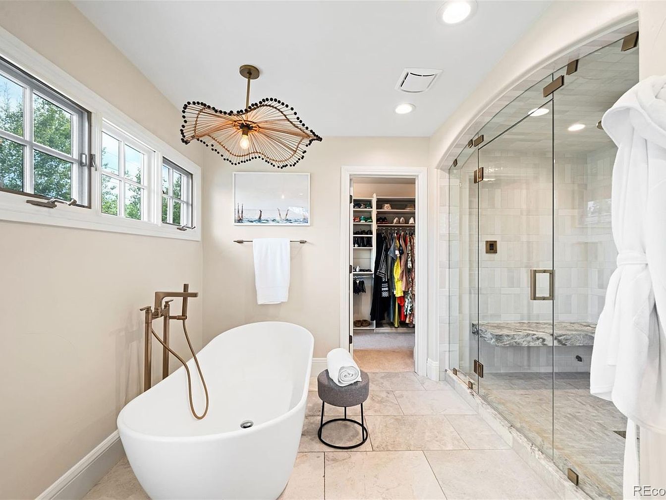 This serene bathroom features a freestanding modern white tub with a sleek bronze faucet positioned near a row of three horizontal windows that bring in ample natural light. The soft beige walls complement the large neutral-toned floor tiles, creating a warm and inviting atmosphere. A unique overhead pendant light with an organic shape adds artistic flair. The spacious glass-enclosed walk-in shower highlights light gray patterned tile with a built-in stone bench, accented by bronze hardware matching the tub faucet. The bathroom connects directly to a walk-in closet, enhancing functionality and luxury.