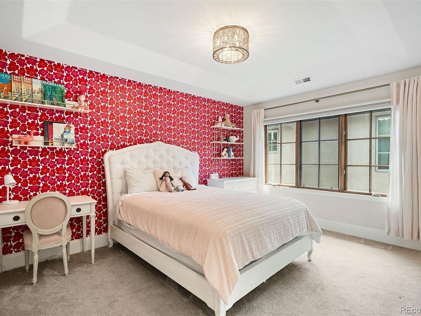 This bedroom features a striking red floral accent wall that adds bold character against a backdrop of predominantly soft neutrals. The bed, with its tufted white headboard and light pastel bedding, balances the vibrant wallpaper, creating a cozy and inviting atmosphere. A small white desk and a cushioned chair occupy the corner, offering a functional workspace. Floating shelves display books and decorative pieces, enhancing the room’s charm. A large window with sheer white curtains illuminates the space with natural light, while the plush beige carpet and simple ceiling light fixture contribute to an overall warm and comfortable feel.