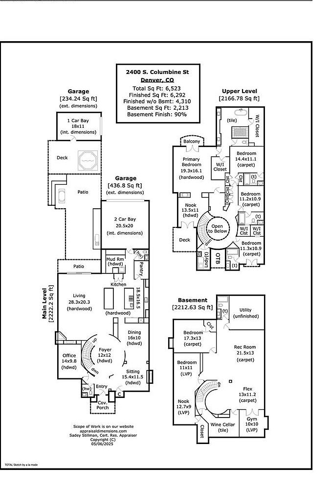 This detailed floor plan outlines a spacious multi-level home with a seamless flow between functional areas. The main level highlights open living, dining, and kitchen spaces, all featuring hardwood floors to create an elegant and warm atmosphere. An office near the foyer adds a professional touch. The upper level hosts a primary bedroom with a balcony and walk-in closets, alongside multiple carpeted bedrooms each with ample closet space. The basement includes versatile recreational rooms, bedrooms, a gym, and a wine cellar, emphasizing luxury and flexibility. Multiple patios, decks, and garages provide practical outdoor and vehicle storage integration. Overall, the plan shows a balanced blend of classic design and modern comforts.