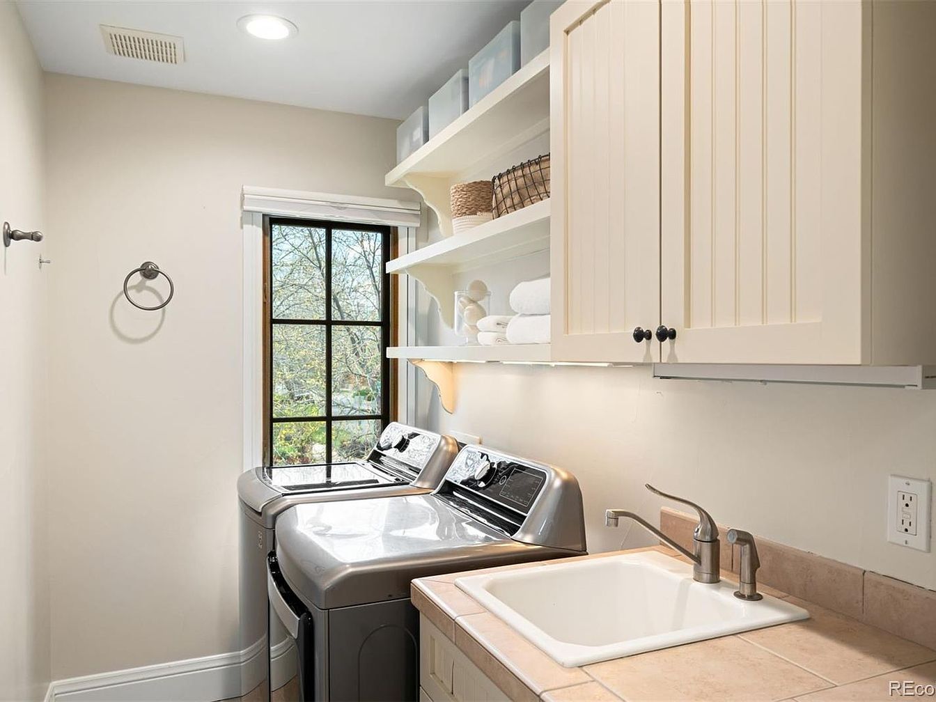 This quiet laundry space offers a streamlined, functional layout with a front-load washer and dryer placed side by side beneath two open white shelves and a set of beadboard cabinet doors. The shelves hold neatly arranged storage bins and baskets, some with rolled white towels, contributing to a clean and organized vibe. The walls and cabinetry are dressed in light warm beige tones, complemented by the soft taupe tile countertop surrounding a deep, white utility sink with a brushed nickel faucet. A black-framed window brings natural light, while subtle under-cabinet lighting enhances visibility for chores.