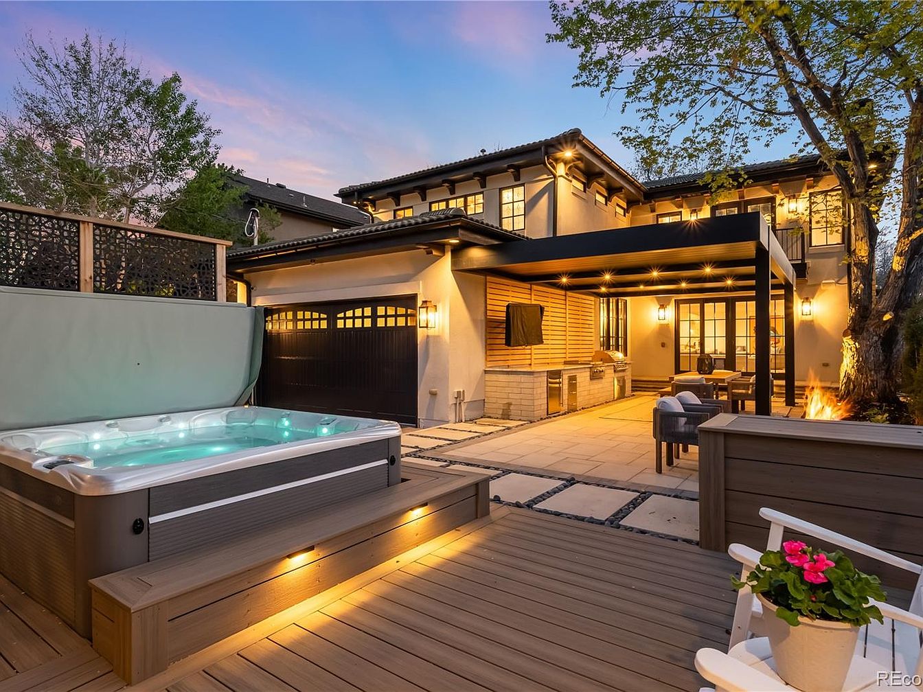 This outdoor patio area features a spacious wooden deck with integrated LED lighting along the steps leading to a modern hot tub filled with softly glowing water jets. Adjacent to the deck, large stone pavers create a neat pathway toward a covered outdoor kitchen and dining space. The covered area incorporates wooden slats for privacy and warmth, paired with soft, recessed lighting that illuminates the space in the evening. Comfortable patio seating surrounds a fire feature under tall trees, adding a cozy ambiance while the home’s exterior showcases warm beige stucco walls, black-framed windows, and a dark garage door, blending modern and inviting design elements.