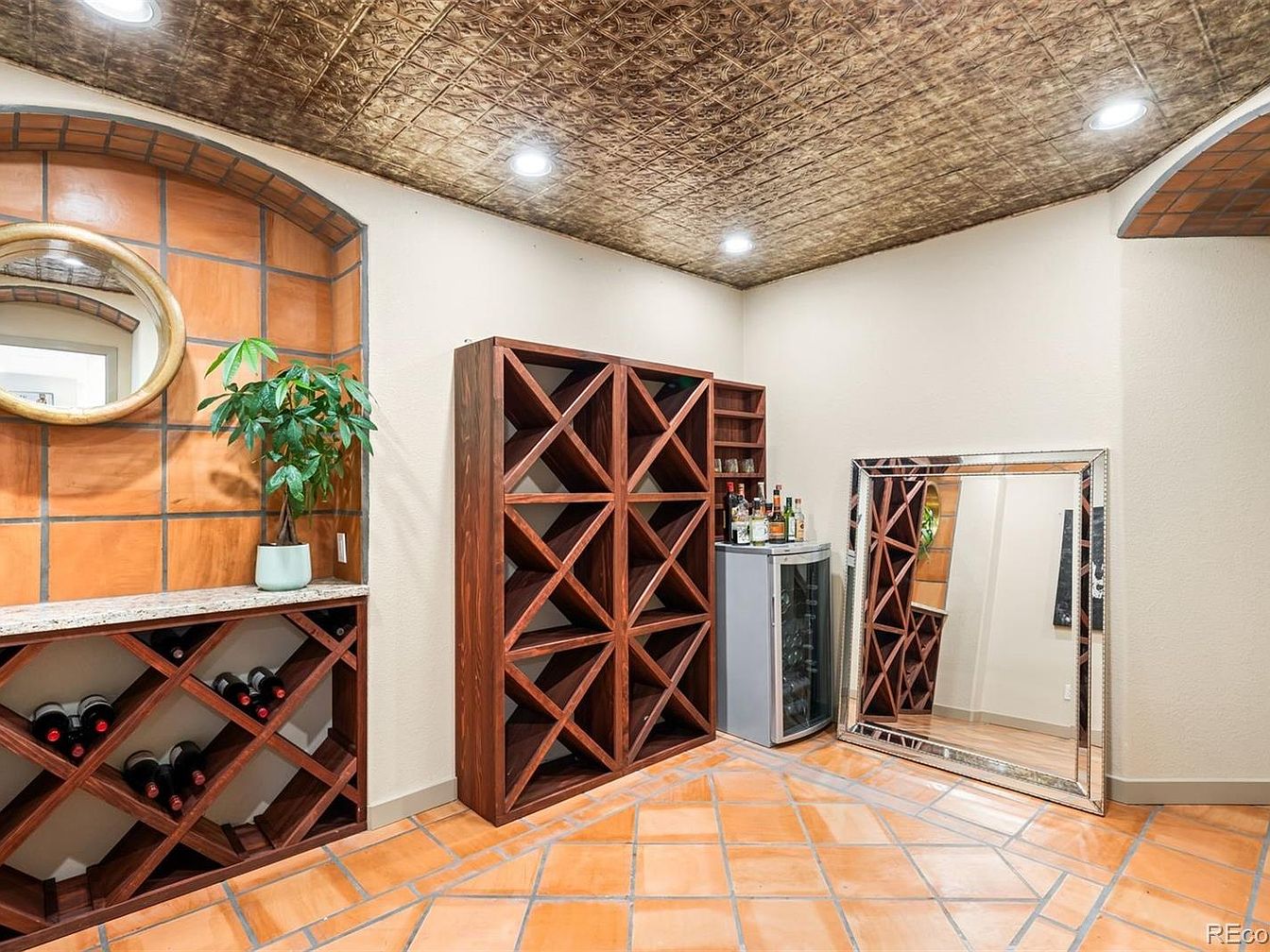 This intimate wine cellar features rich terracotta tile flooring and matching tile accents in inset wall niches, creating a warm, rustic feel. The ceiling is adorned with an intricate, metallic pressed-tin design illuminated by recessed lighting, adding a vintage elegance. Custom wooden wine racks with diamond-shaped compartments provide ample storage, complemented by a small beverage fridge topped with various bottles, emphasizing functionality alongside style. A large framed mirror resting on the floor adds depth and reflection to the space. A simple potted plant injects a touch of greenery, balancing the earthy tones throughout this cozy and inviting wine storage area.