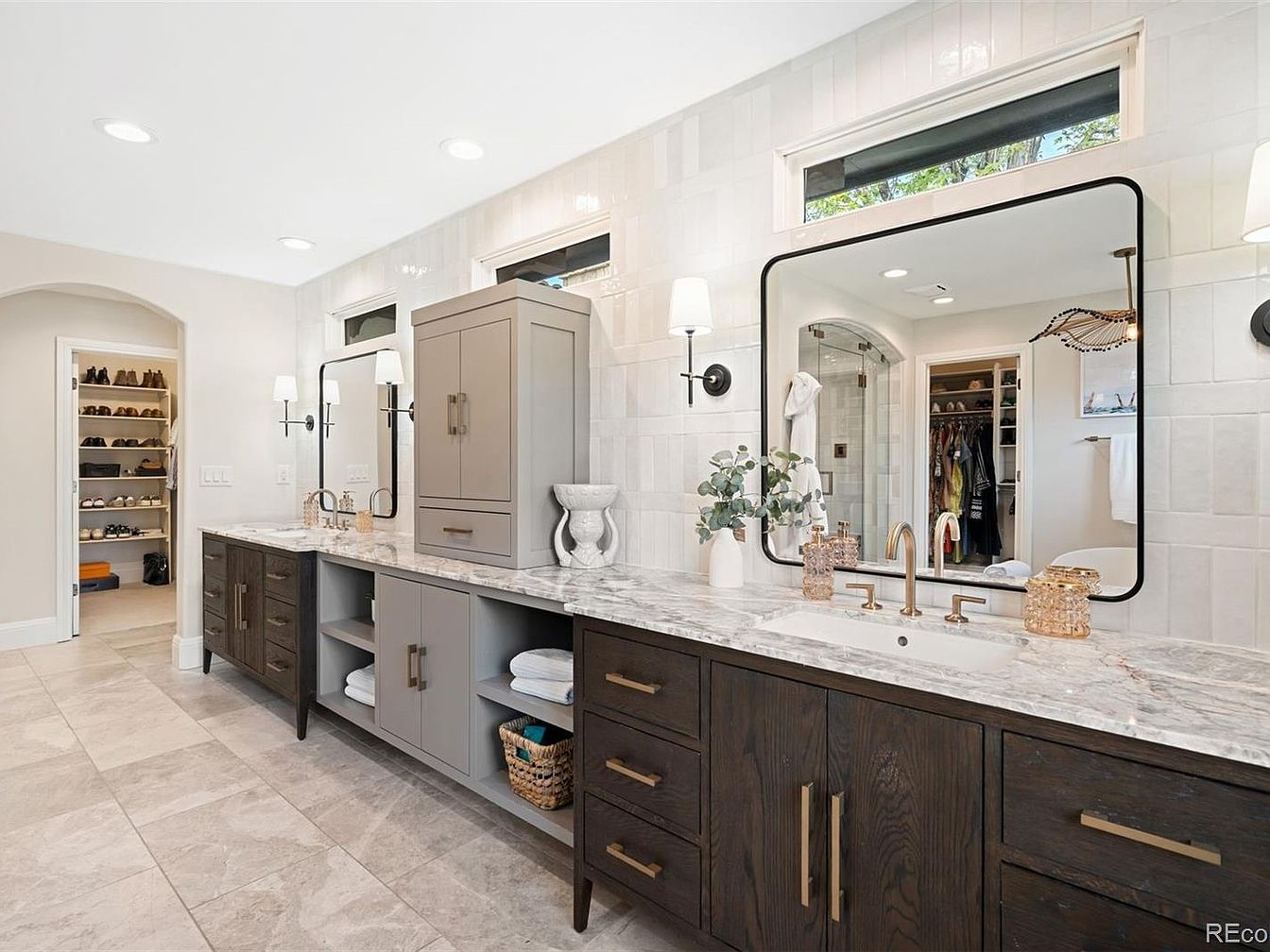 This bathroom features a spacious double vanity with a striking marble countertop that blends shades of white and gray. The cabinetry combines dark wood with matte gray finish, creating a balanced contrast. Two large, rectangular mirrors with thin black frames hang above the sinks, flanked by elegant wall-mounted sconces with white shades for soft lighting. The backsplash and walls are adorned with glossy white subway tiles arranged in a subtle pattern. Large rectangular floor tiles in muted beige complement the clean, modern aesthetic. Natural light filters in through small transom windows, enhancing brightness. A doorway leads to a walk-in closet, emphasizing functional luxury and organization.