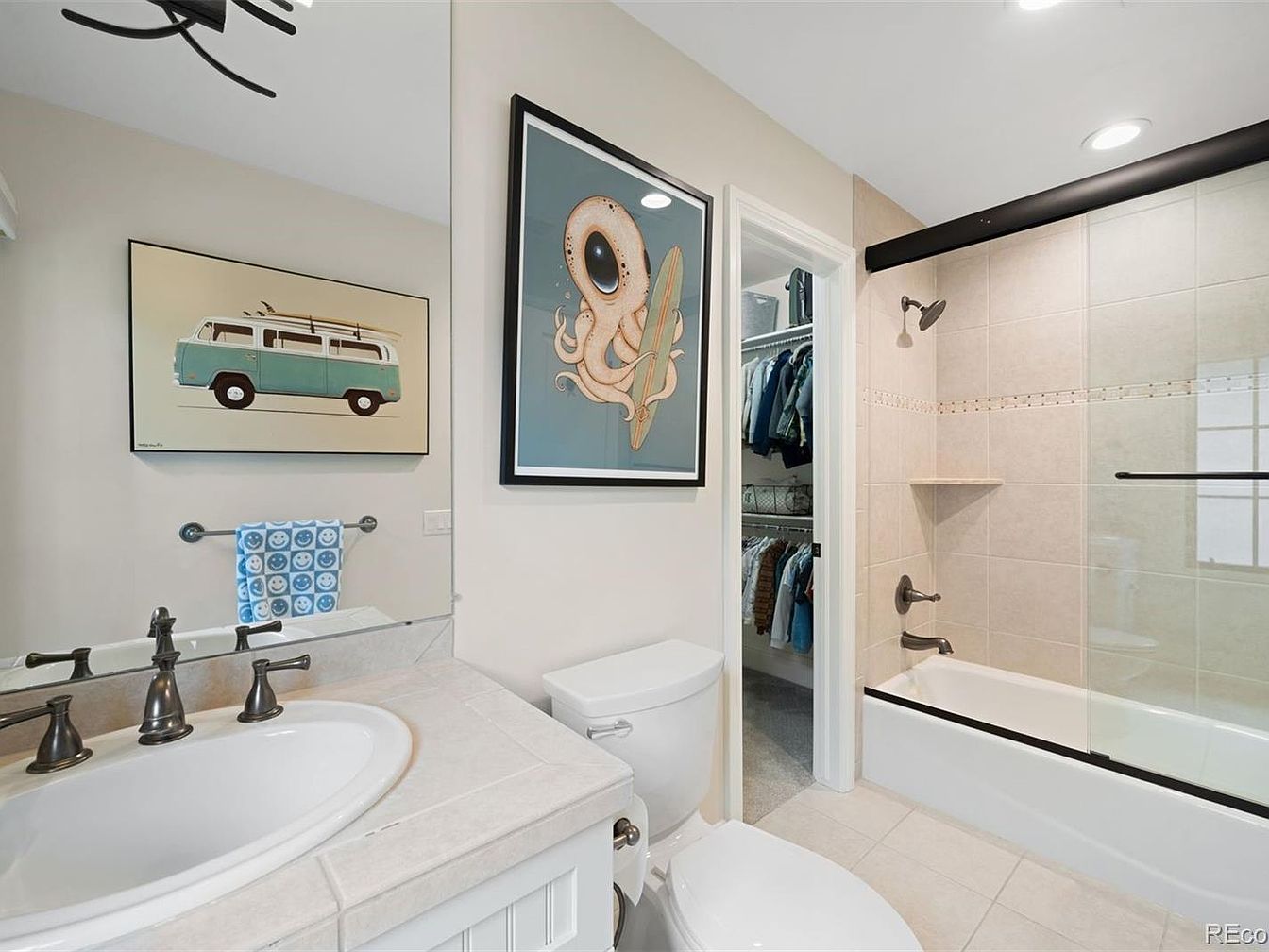 This compact yet well-designed bathroom features a neutral color palette with beige tile flooring and tiled shower walls that create a clean, calming atmosphere. The bathtub is enclosed with clear sliding glass doors framed in black, complemented by oil-rubbed bronze fixtures that add subtle contrast. A white vanity with a tiled countertop sits adjacent to a white toilet, maintaining a cohesive look. Two playful art pieces—the blue-green van and the octopus holding a surfboard—inject personality. The open doorway leads to a spacious and organized walk-in closet, emphasizing smart use of connected space for functionality and storage.