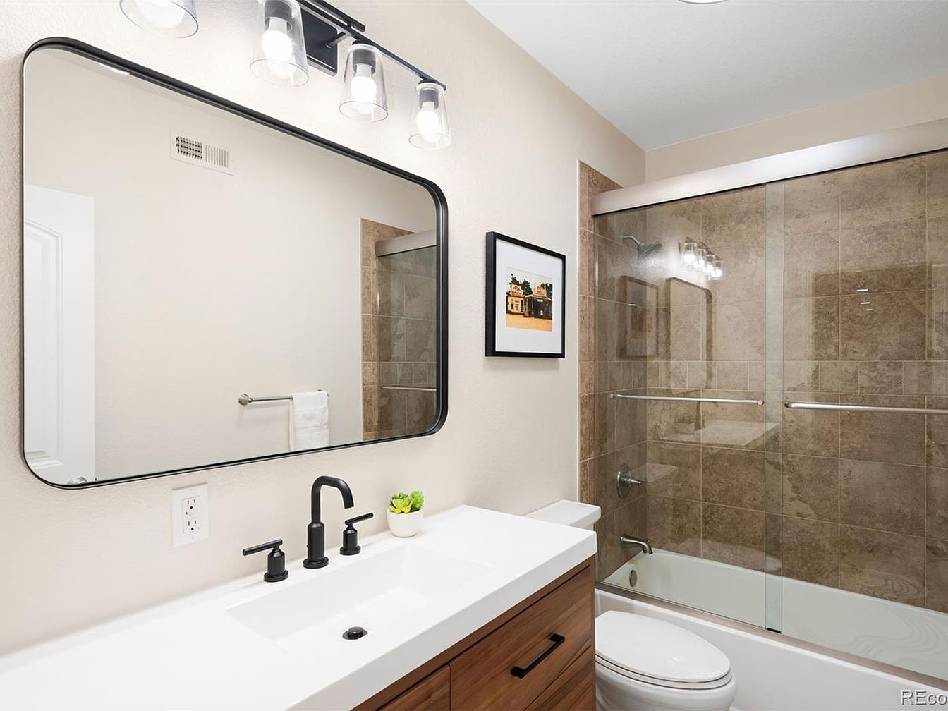 This bathroom features a modern and clean design with a sleek white countertop and integrated sink set atop a wooden vanity with black hardware, creating a warm yet contemporary contrast. A large rectangular mirror with a thin black frame spans the wall above, highlighted by a trio of clear glass light fixtures. The tub and shower combination features earth-toned tile walls with a subtle texture, enclosed by a sliding glass door with chrome handles. A small framed artwork adds a personal touch, while the overall neutral palette combines warmth and sophistication.