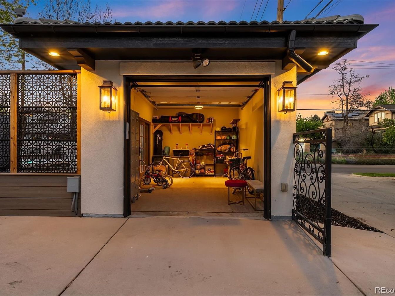 This cozy garage is thoughtfully organized with a strong emphasis on practicality and warm lighting. Neutral beige walls and a concrete floor create a clean, functional backdrop. The garage door is open, revealing a mix of bicycles, sports equipment, and shelving units for storage. Metal lockers stand on the left for additional storage, while wooden shelves mounted near the ceiling maximize vertical space. Two wall-mounted lantern-style lights frame the garage entrance, complementing the black wrought-iron-open gate, which adds a rustic artistic touch. The roof features dark tiles that provide a classic Mediterranean vibe, contrasting softly with the sky at dusk.