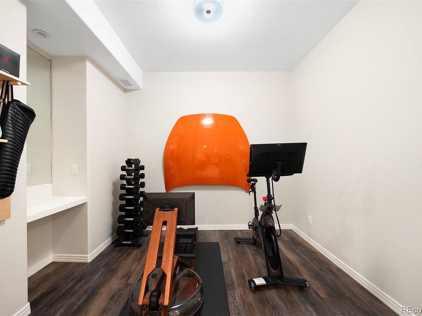 This compact home gym features a clean, minimalist design enhanced by warm, dark wood-look flooring that contrasts softly with the bright white walls and trim. The space includes a rowing machine and a stationary bike positioned side by side, each facing forward for optimal workout engagement. Against the far wall, a striking orange car hood wall art adds a bold industrial-modern accent, infusing vibrant color and personality into the room. A tiered rack of black dumbbells offers strength training options, while a built-in floating white shelf to the left provides practical storage or display space, maintaining the uncluttered atmosphere.