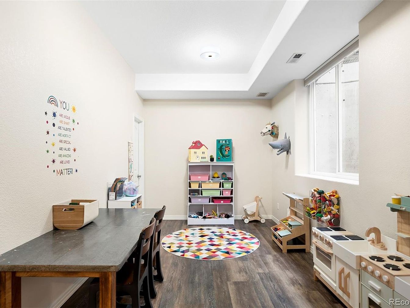 This cozy playroom features a neutral palette with beige walls and rich dark wood flooring that create a warm yet modern atmosphere. A long wooden table with black chairs lines one side, providing space for crafts or learning activities. Vibrantly colored storage bins in a white shelving unit offer both organization and playful accents. A round, multicolored geometric rug anchors the center, adding a burst of energy. Toy kitchen sets and wall-mounted animal heads lend charm, while a large window ensures ample natural light, making the space inviting and perfect for children’s creativity and play.