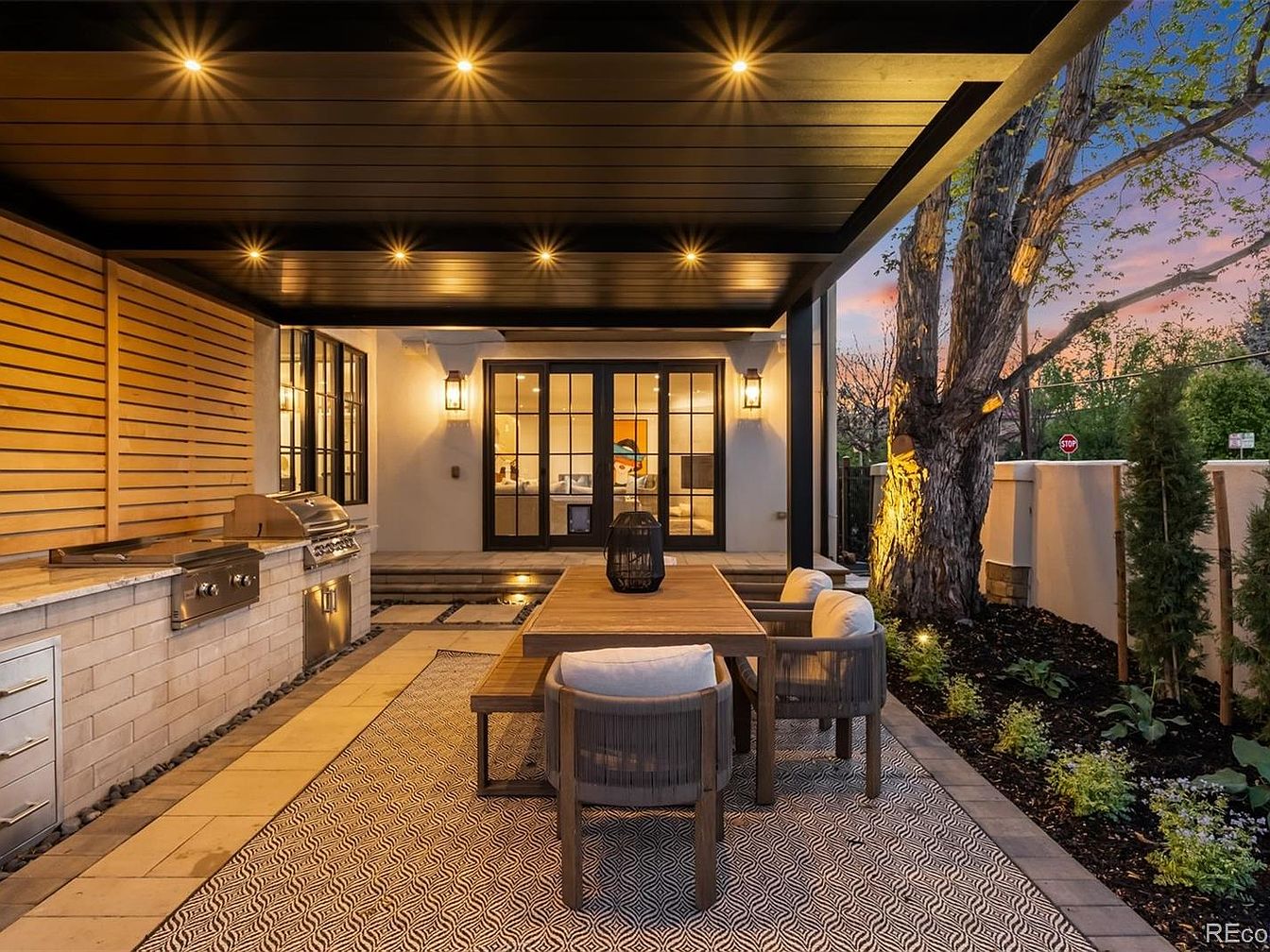 This inviting outdoor space features a sleek covered patio with a dark wooden ceiling highlighted by recessed lighting. On one side, a built-in stainless steel grill and countertop extend along a light stone wall with horizontal wooden slats creating visual interest. The dining area centers around a wooden table with matching bench seating and cushioned chairs, all placed on an elegant patterned outdoor rug. Adjacent mulch beds with neatly trimmed shrubs and éclairage around a mature tree enhance the natural ambiance. French doors with black frames connect this area seamlessly to the home’s interior, blending comfort and functionality.