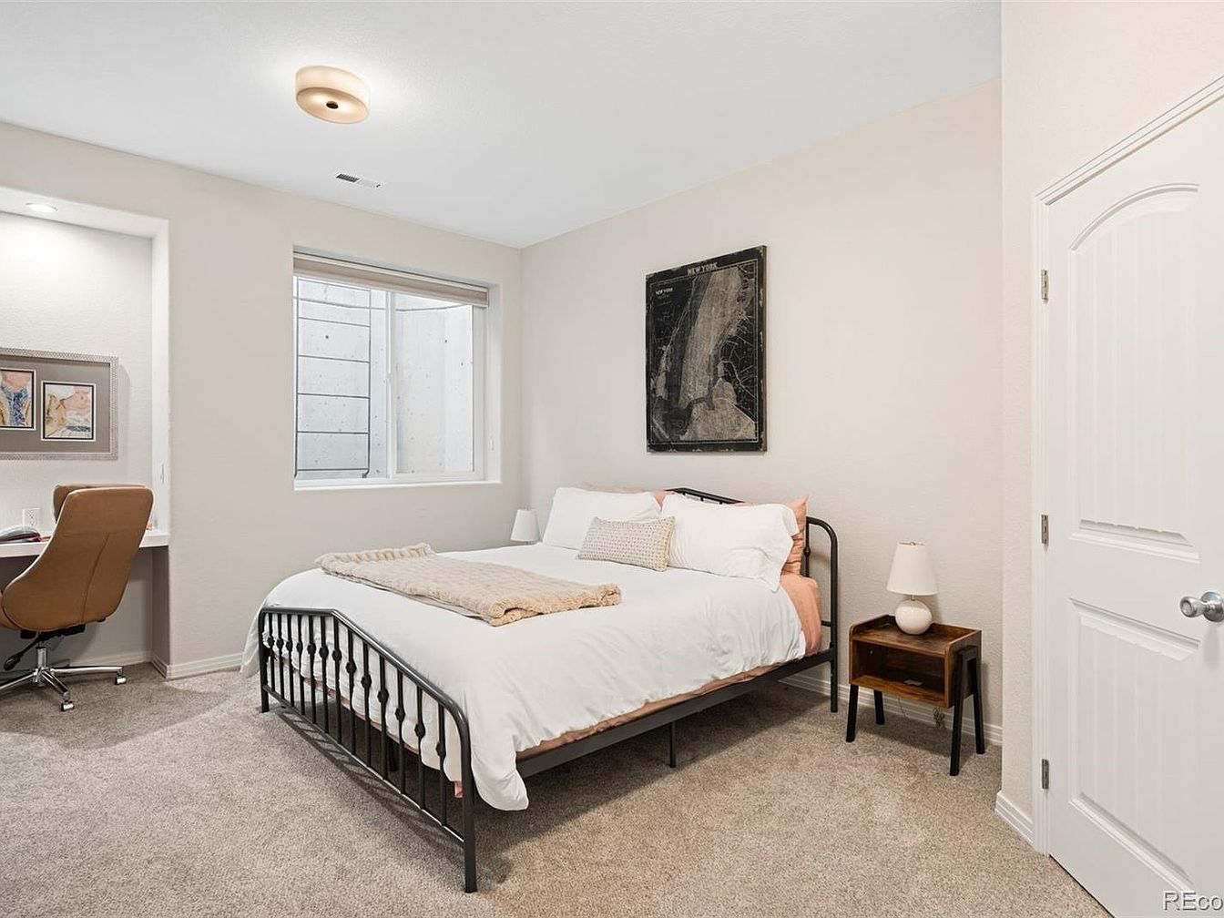 This bedroom offers a calm and inviting atmosphere characterized by neutral beige walls and soft carpet flooring that adds warmth underfoot. A black metal bed frame with white bedding contrasts gently with subtle peach-colored sheets and a cozy knitted throw, while a textured lumbar pillow adds an extra layer of comfort. To the right, a minimalist wooden nightstand holds a simple white lamp, providing soft lighting for nighttime reading. A framed monochromatic map artwork hangs above the bed. An adjacent built-in desk nook with an ergonomic brown leather chair creates a convenient workspace bathed in natural light from a nearby window with a roll-up shade, enhancing functionality without sacrificing the room’s tranquil ambience.