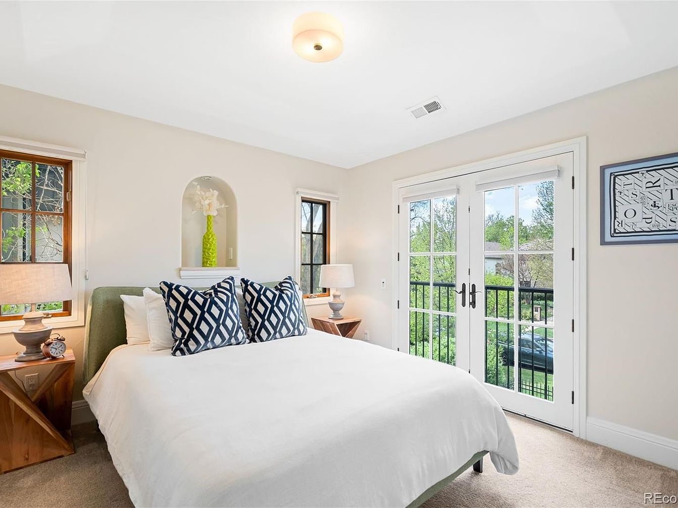 This cozy bedroom features a calm, neutral palette with off-white walls and soft beige carpeting, creating a tranquil ambiance. The centerpiece is a bed with a green upholstered headboard, dressed in crisp white linens and accented with two navy and white geometric-patterned pillows. Flanking the bed are two wooden bedside tables, each topped with a classic lamp that adds warmth to the space. Natural light floods the room through two small windows and a set of French doors that open to a balcony, offering views of lush greenery outside. An arched niche above the bed holds a lime-green vase with white flowers, adding a subtle pop of color and architectural interest.