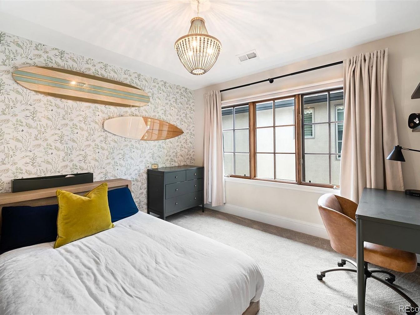 This bedroom blends comfort with coastal charm, highlighted by two wooden surfboards mounted on a floral-patterned accent wall. The bed is dressed in crisp white bedding, accented with deep navy and vibrant mustard yellow pillows for a pop of color. A sleek black dresser stands against the wall, complementing a minimalist study area featuring a dark wooden desk and a modern caramel leather swivel chair. Natural light pours in through a wide divided-pane window framed with soft beige curtains, while a beaded chandelier overhead adds a touch of elegance to the neutral-toned carpeted floor, creating an inviting and balanced aesthetic.