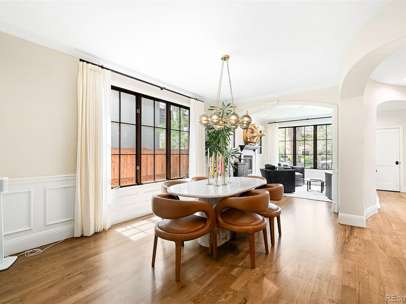 This elegant dining space features a sleek white oval table surrounded by six caramel leather chairs with curved backs, exuding contemporary charm. The floors are a warm wood tone that complements the soft beige walls with white wainscoting, adding a touch of classic architectural detail. Large, dark-framed windows dressed in floor-to-ceiling cream curtains flood the room with natural light, enhancing the airy atmosphere. A modern chandelier with globe lights hangs above the table, serving as a focal point. Beyond the dining area, an inviting living room with black leather chairs and a fireplace creates a seamless flow between spaces. The arched entryway and overall neutral palette add warmth and sophistication to the layout.
