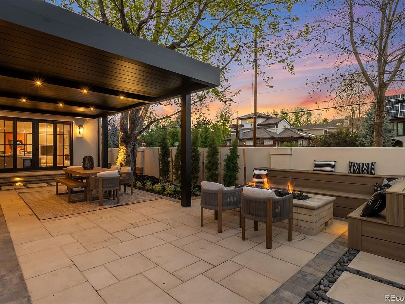 This outdoor patio offers a seamless blend of comfort and style with a spacious tiled floor extending to a covered dining area. The dark wood pergola overhead features recessed lighting, creating an inviting ambiance for evening gatherings. A wooden table with benches and cushioned chairs sits atop a textured beige rug, ideal for alfresco dining. On the opposite side, a modern firepit surrounded by cozy armchairs and built-in wooden bench seating with black-and-white patterned pillows provides a warm, intimate setting. The surrounding greenery and privacy wall nicely frame the space, complementing the soft hues of the sunset sky.