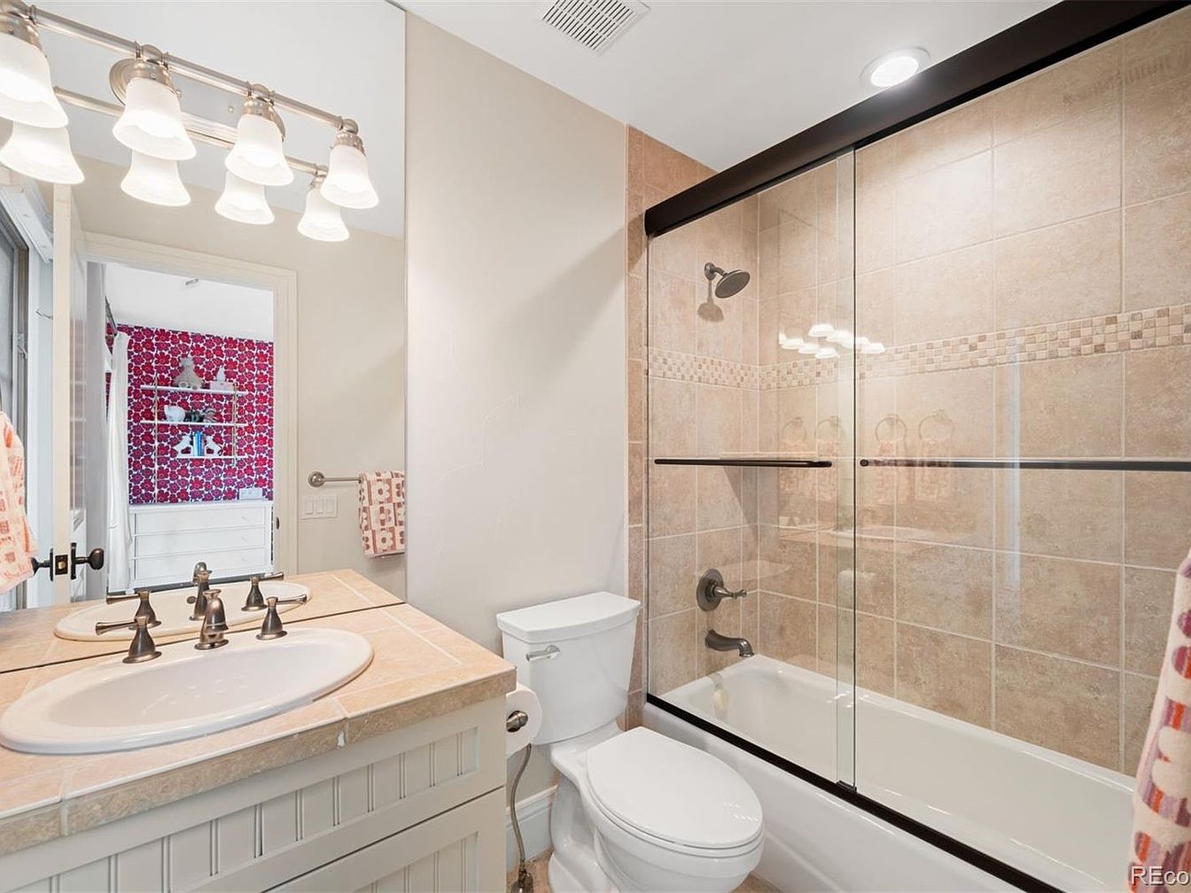 This bathroom features a practical and inviting layout with a neutral color scheme centered around beige tiles and cream tones. A bathtub with a sliding glass door and built-in showerhead is tiled in a warm, textured beige with a decorative mosaic band that adds subtle detailing. The vanity has a tiled countertop in matching beige tones, topped with an oval white sink and dark bronze fixtures that contrast elegantly. Above the vanity, a wide mirror reflects light from the multi-bulb fixture, enhancing brightness. The white toilet is positioned beside the tub, and a glimpse through the doorway reveals a vibrant, patterned adjacent room, adding unexpected color contrast.