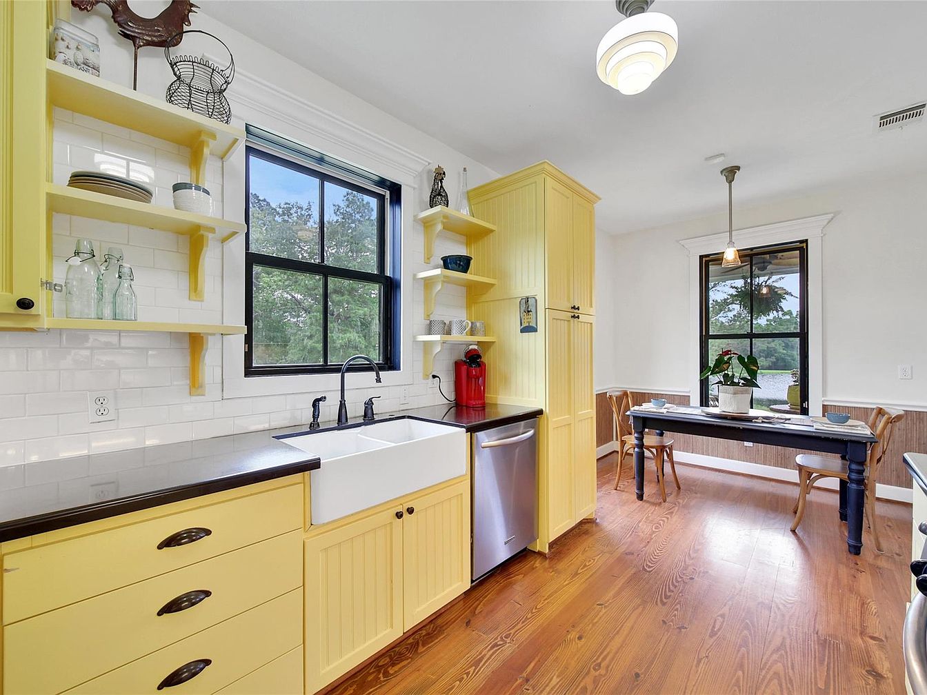 This charming kitchen features cheerful yellow cabinetry with beadboard paneling and open shelving that adds both storage and a decorative touch. A farmhouse-style white apron-front sink is set beneath a large black-framed window, creating a pleasant workspace with natural views. The countertops are dark, contrasting nicely with the bright cabinets and white subway tile backsplash. Hardwood floors extend through into a cozy breakfast nook, where a black-painted wooden table is paired with natural wood chairs. Large windows in both areas bring in abundant natural light, enhancing the airy, welcoming ambiance of this homey kitchen space.