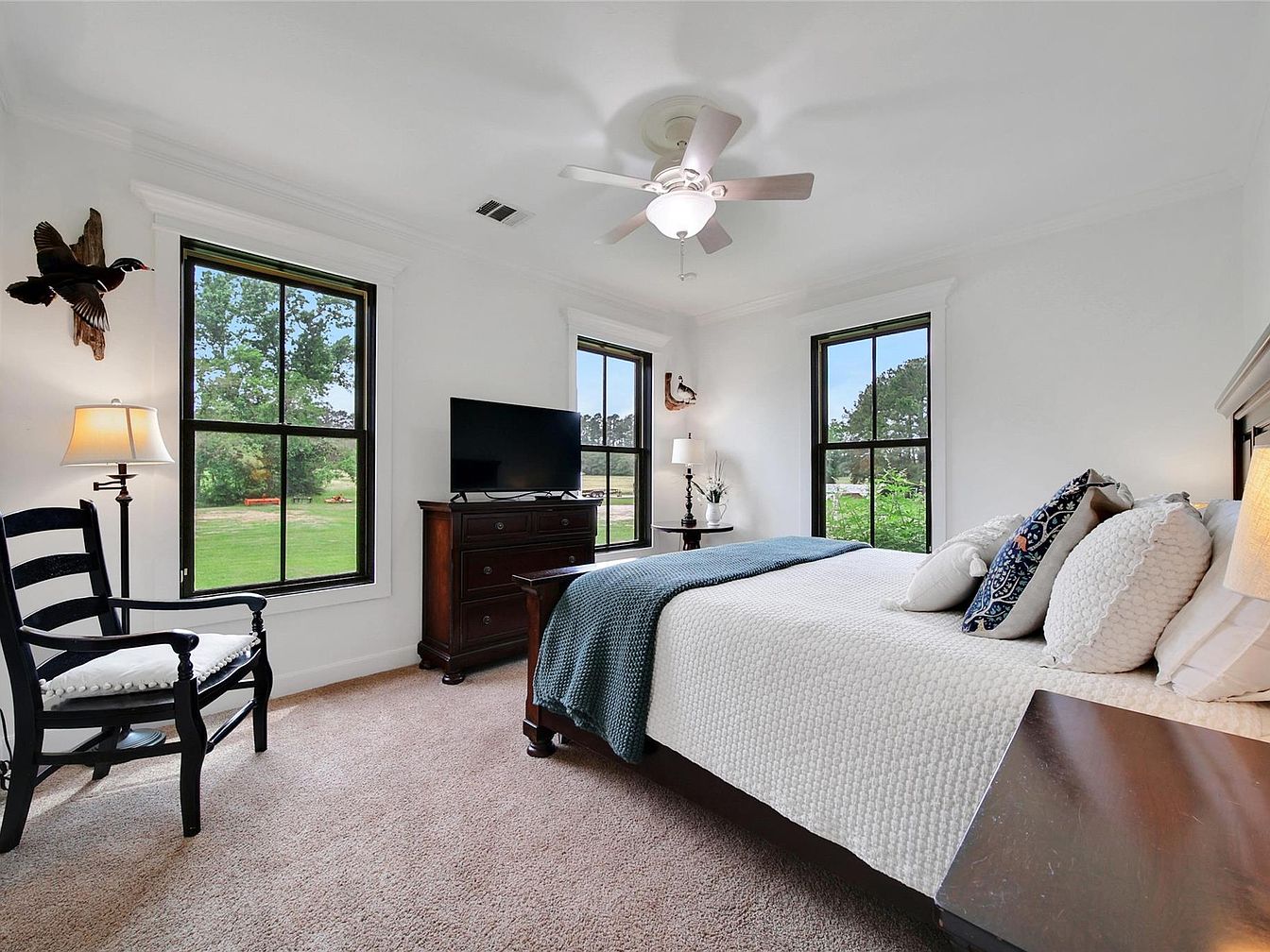 This bedroom boasts a tranquil, airy atmosphere with three large windows framed in dark trim that invite abundant natural light and offer serene views of lush greenery outside. The walls and ceiling are painted crisp white, creating a fresh and clean backdrop. A ceiling fan with a light fixture hangs centrally for comfort. Dark wood furniture, including a dresser and bedside tables, contrasts beautifully with the beige carpet and white bedding, which is layered with textured pillows and a soft blue throw. Traditional elements like a wooden rocking chair and mounted bird decor add rustic charm.