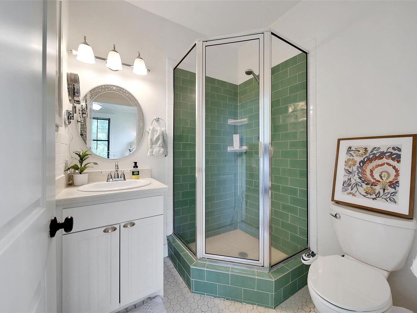 This bathroom features a compact yet functional layout centered around a corner shower with striking green subway tiles and a clear glass door framed in metal, creating a modern focal point. The white vanity with paneled cabinet doors supports a light countertop and an oval sink, complemented by a round mirror with delicate etched patterns. Above the vanity, three soft-glowing light fixtures add warmth, while a small green plant adds a touch of nature. To the right, a standard white toilet holds a framed, colorful botanical artwork on top, enhancing the room’s clean and inviting aesthetic. The floor’s white hexagonal tiles tie the design together with subtle texture and brightness.