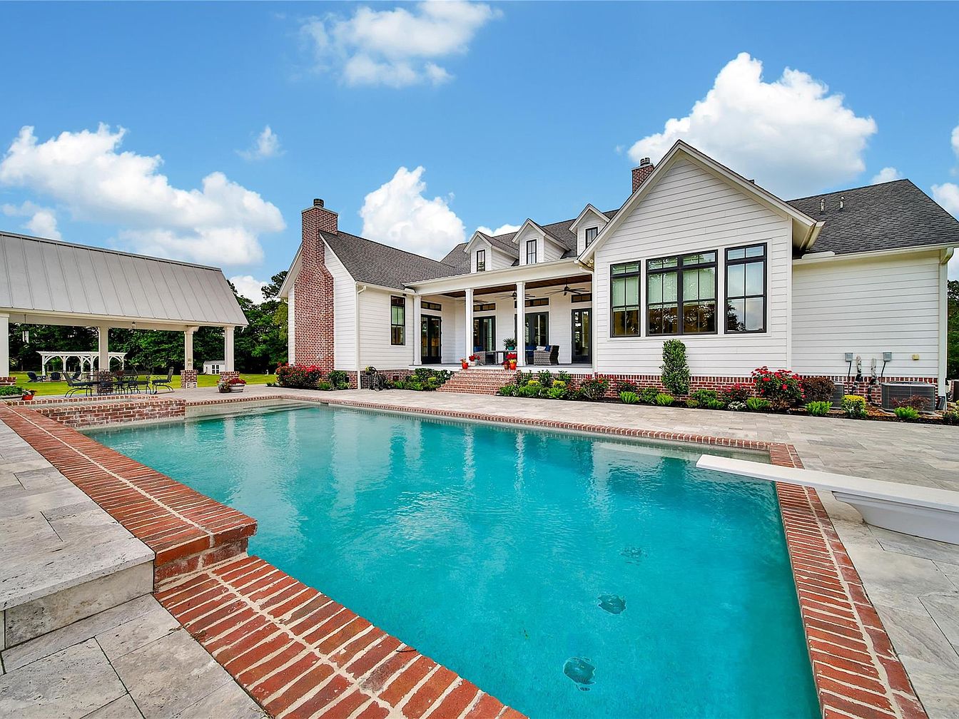 This inviting backyard features a spacious rectangular swimming pool bordered with classic red brick coping, creating a timeless contrast with the pale stone poolside deck. The house’s exterior boasts crisp white siding complemented by dark-framed windows, blending modern farmhouse charm with traditional elements. Steps lead from the pool area to a covered porch furnished with seating, encouraging outdoor relaxation. A detached pavilion with a metal roof and brick pillars offers a shaded retreat for dining or gatherings. Surrounding landscaping includes manicured shrubs and vibrant flowers, enhancing the serene and welcoming outdoor atmosphere under a bright blue sky dotted with fluffy clouds.