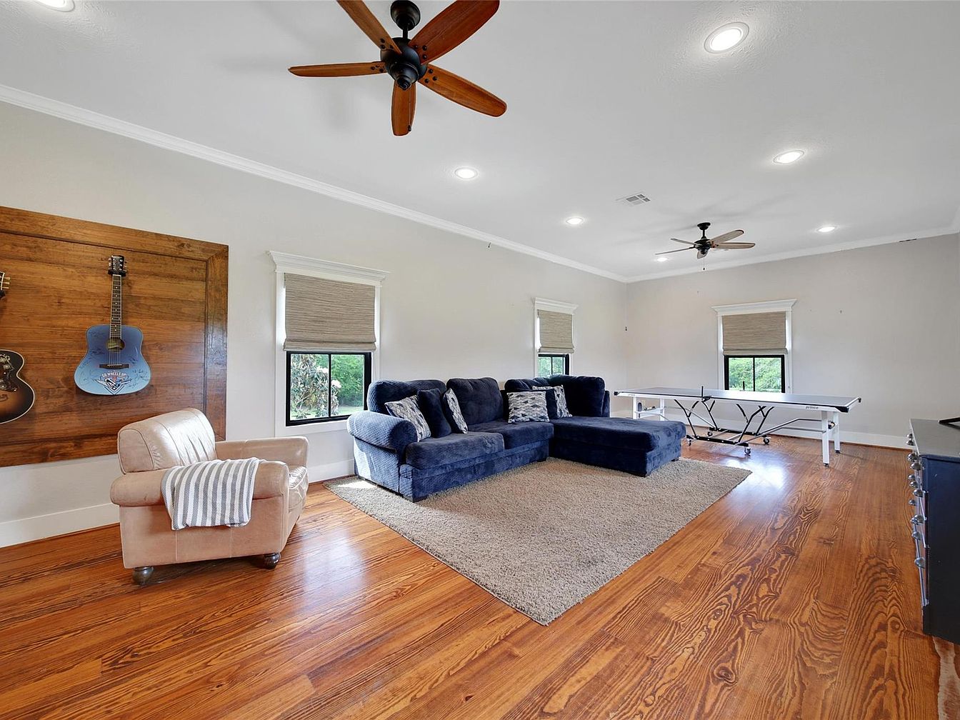 This spacious recreation room combines relaxation and entertainment with a clean, modern aesthetic. Warm wooden floors create a natural foundation, accentuated by neutral-toned walls that invite ample natural light through three modestly-sized, black-framed windows dressed with simple roman shades. A deep navy sectional sofa, complemented by patterned throw pillows, anchors a cozy beige area rug in the center, offering ample seating. To one side, a plush beige armchair adds an inviting touch near a wooden accent wall showcasing decorative guitars. Ceiling fans with wooden blades blend function and style, while a ping pong table at the far end nods to leisure activities within the room.