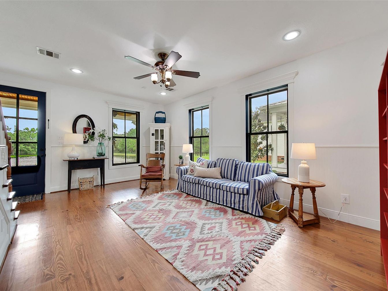 This living room offers a bright and airy layout featuring wide plank wooden flooring that adds warmth and texture. Crisp white walls and trim frame three large windows, allowing ample natural light to fill the space while providing views of the greenery outside. A striped blue and white sofa anchors the seating area, complemented by a patterned area rug in soft pastels, introducing subtle color and pattern. Traditional furnishings include a wooden rocking chair, a round side table with a simple white lamp, and a small console table with decorative accents. The ceiling fan with light fixtures provides functional charm, highlighting a cozy yet fresh farmhouse aesthetic.