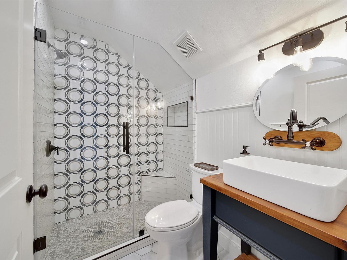 This compact bathroom features a walk-in shower with a glass enclosure, highlighting a bold, circular patterned accent wall in shades of gray and white. The shower floor is textured with small pebble-like tiles, contrasting with the smooth white subway tiles on the adjacent walls. A built-in shower bench adds extra convenience. The vanity combines a rich wooden countertop with a dark navy-blue base, supporting a sleek, rectangular white vessel sink. Above it, an oval mirror and vintage-style bronze faucet fixtures mounted on a wooden backplate add charming rustic warmth to the otherwise modern, clean-lined space. White beadboard wainscoting and light gray hexagonal floor tiles complete this thoughtfully designed bathroom.