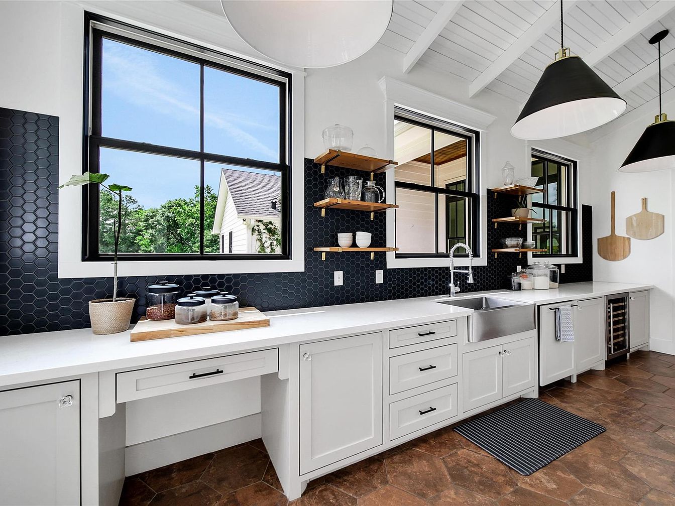 This kitchen features a long white countertop paired with classic white cabinetry, creating a bright and welcoming atmosphere. The black hexagonal tile backsplash adds texture and contrast, drawing attention to the prep and sink area beneath three large windows that flood the room with natural light. Open wooden shelves with brass brackets display clear glassware and ceramics, contributing to an airy, organized look. Two oversized black pendant lights with brass accents hang from the white vaulted ceiling with exposed beams, complementing the black window frames. The warm brown hex tile flooring adds earthy tones and rustic charm. An apron-front stainless steel sink and wine cooler complete the modern farmhouse aesthetic.