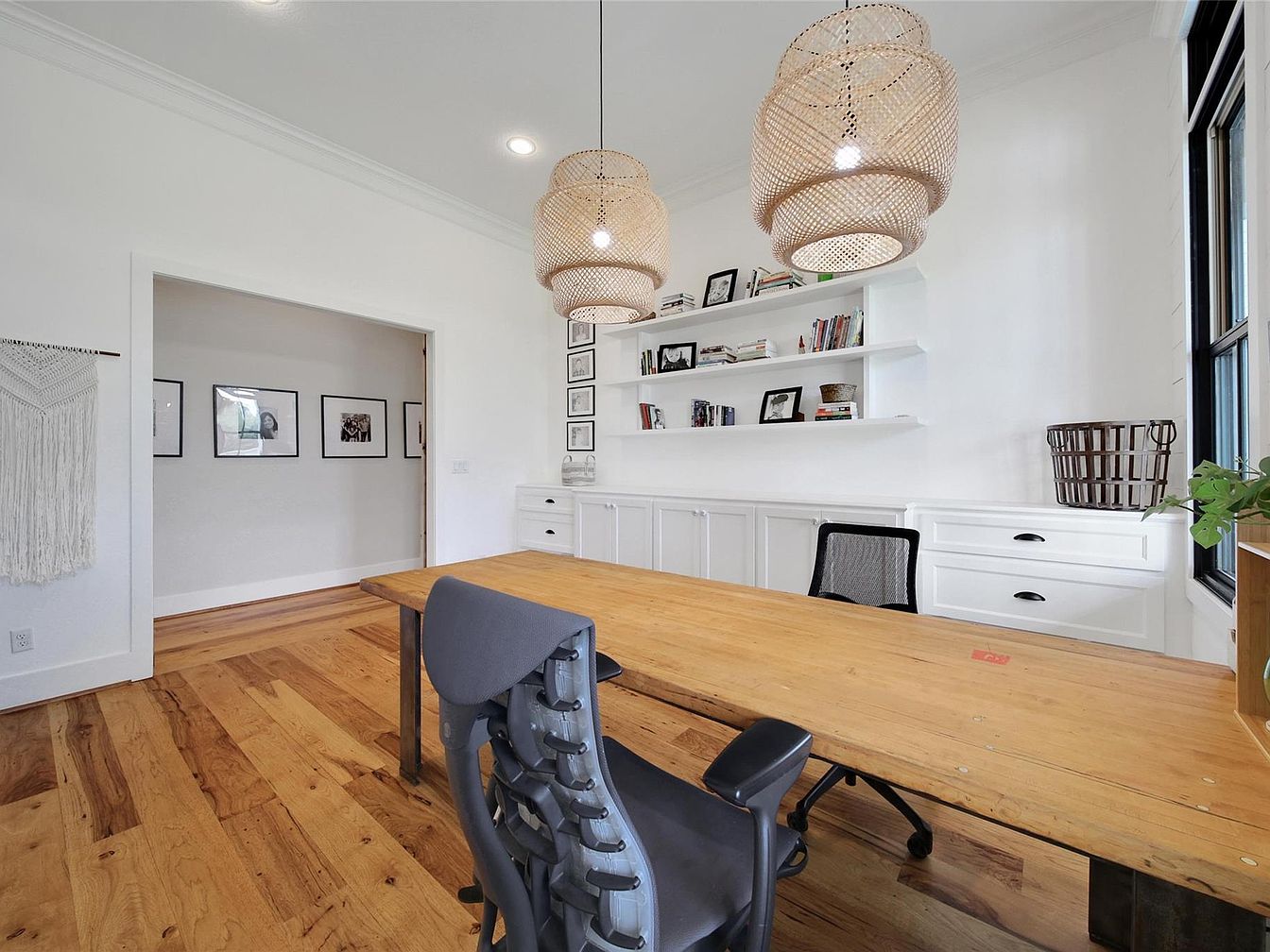 This home office features a clean and modern design with a natural wooden table that serves as the centerpiece, paired with ergonomic black office chairs. The flooring is polished hardwood, adding warmth to the predominantly white color scheme. White built-in cabinetry along the back wall provides ample storage, complemented by open floating shelves displaying books and framed pictures. Two large woven pendant lights hang from the ceiling, adding a touch of texture and organic charm. A large window brings in natural light, enhancing the bright and airy atmosphere of this functional and stylish workspace.