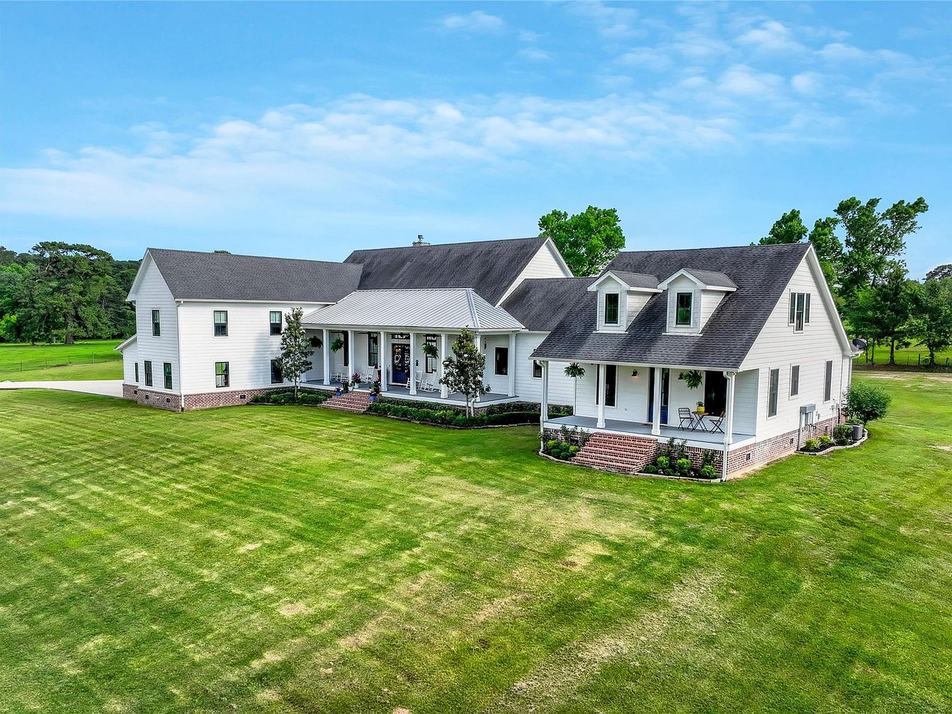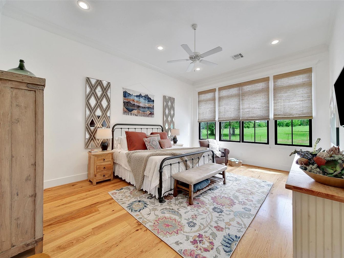 This stunning custom home, located in the serene countryside of Montgomery, TX, exemplifies luxury country living with breathtaking views. The architecture blends classic and modern elements, featuring clean lines, black-frame windows, cedar beams, and soaring ceilings that frame an open-concept layout flooded with natural light. The residence includes five bedrooms and a home office on the main floor, with an upstairs game room, bonus room, and two additional bedrooms. The property also features a charming guest house with a half bath and a long private driveway. Priced at $3,650,000, this exceptional home offers privacy, elegance, and convenience, being close to schools, shopping, and restaurants, making it an ideal estate for luxurious country living.