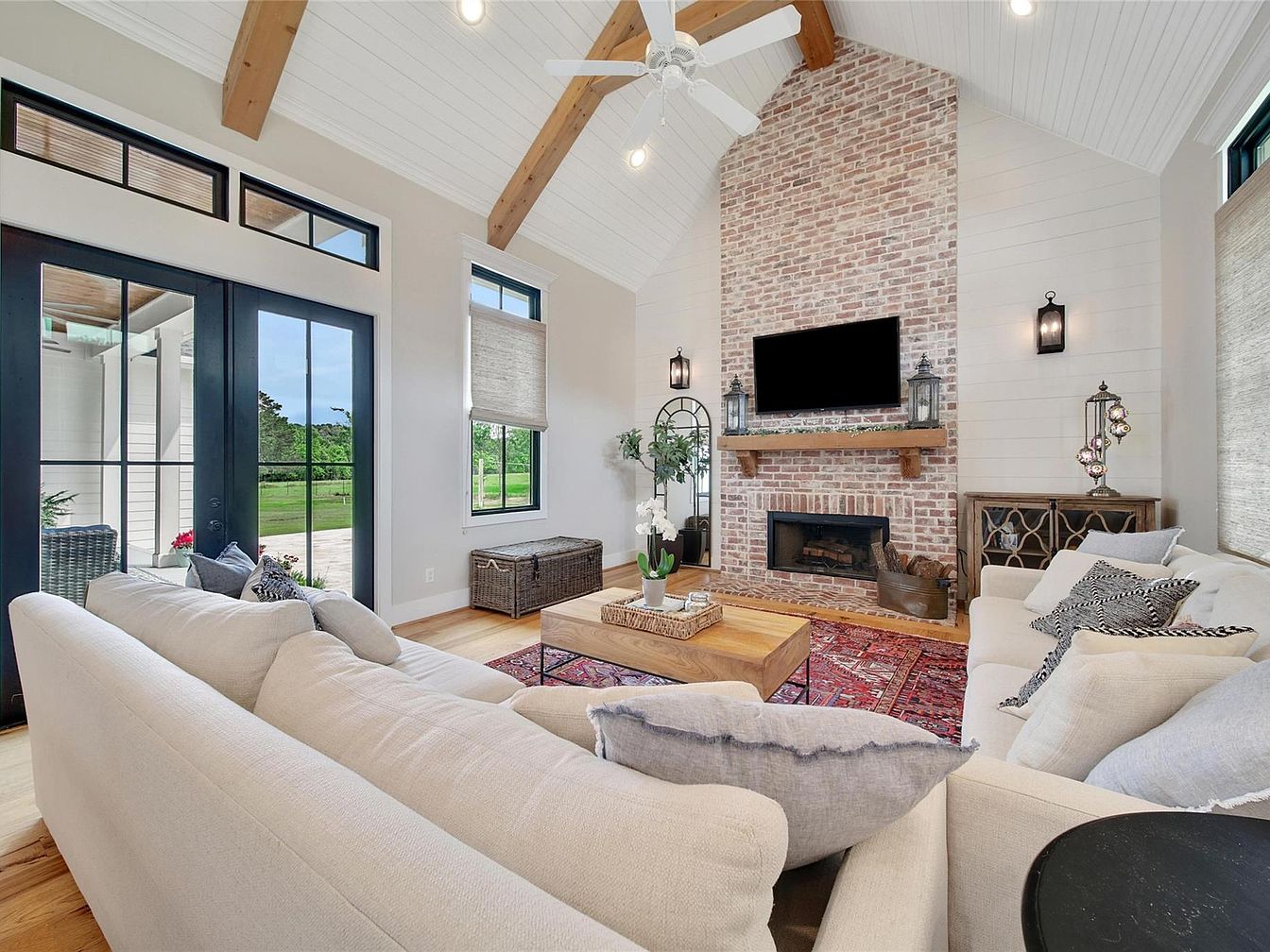 This living room centers around a striking floor-to-ceiling brick fireplace with a rustic wooden mantel, creating a warm focal point. The vaulted ceiling with exposed wooden beams adds architectural interest and an airy, spacious feel. Natural light floods the space through black-framed windows and French doors, which enhance the modern farmhouse vibe. Neutral-toned, plush sofas arranged in an inviting U-shape surround a wooden coffee table atop a richly patterned area rug, adding texture and color. Subtle decorative elements include lantern-style sconces, a large wall mirror, and soft window shades, blending cozy comfort with refined style.