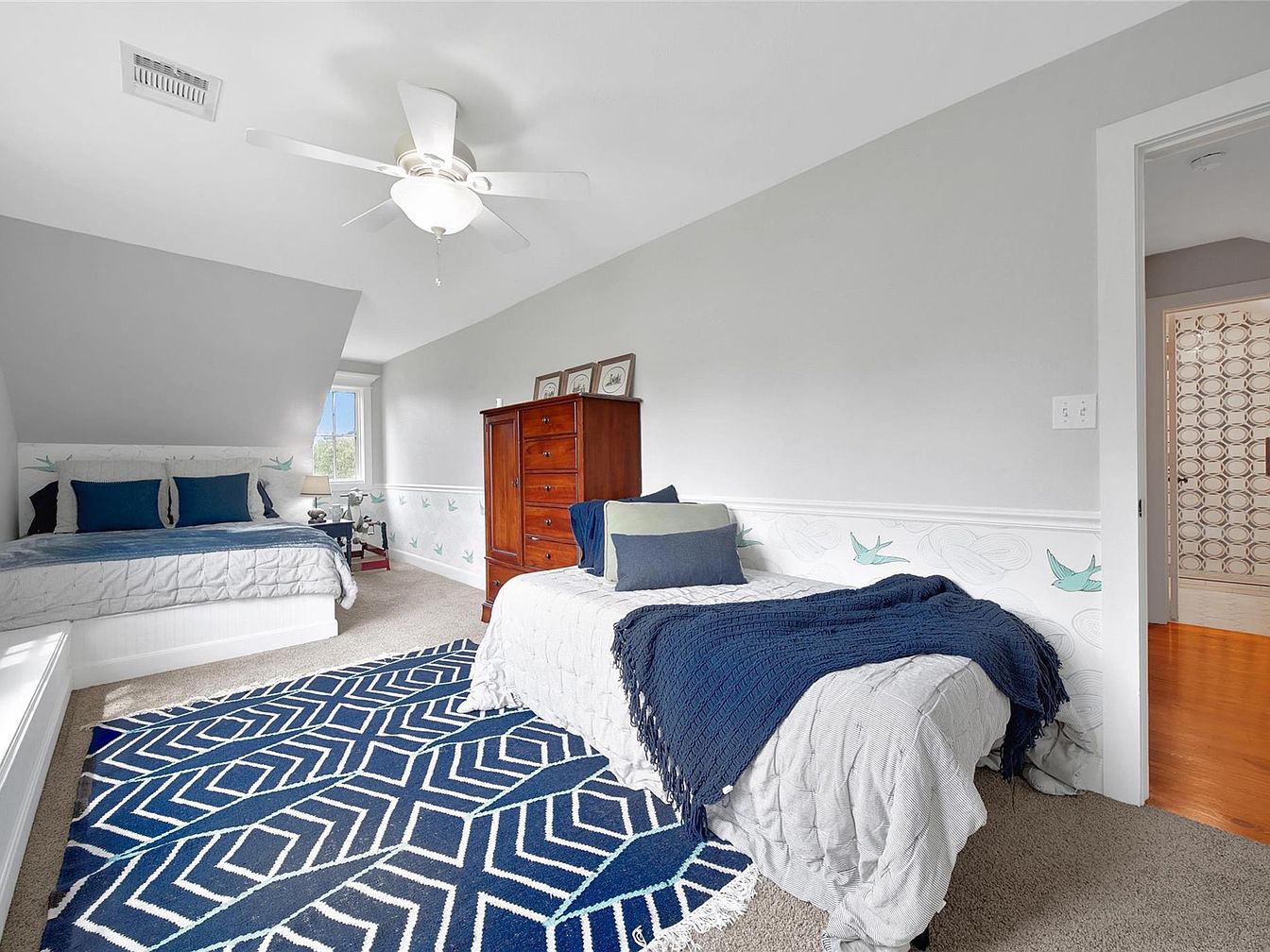 This bedroom features a thoughtful shared layout with two beds placed along one wall, creating a cozy yet open atmosphere. Soft gray walls act as a neutral canvas, while a subtle wallpaper border with delicate teal bird motifs adds a gentle touch of whimsy and color. The carpeted floor offers warmth and comfort beneath a striking large navy and white geometric rug that anchors the space. A wooden chest of drawers provides functional storage and rich contrast. Natural light filters through a window at the far end, accentuating the room’s bright, soothing palette and simple modern décor.