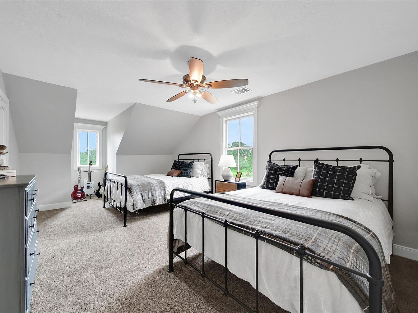 This inviting guest bedroom features two twin black metal frame beds positioned against soft gray walls, contributing to a calm, neutral palette. The beds are dressed in white linens with plaid throw blankets and coordinating cushions in dark tones, adding a cozy element. A single nightstand with a white lamp sits between the beds, illuminated by natural light streaming through a double-hung window framed with classic white trim. Beige carpeting covers the floor, complementing the warm tones of the wooden ceiling fan overhead. The far corner hosts a trio of colorful electric guitars, adding a personal and artistic touch to the space, which includes sloped ceilings contributing to its attic-like charm.