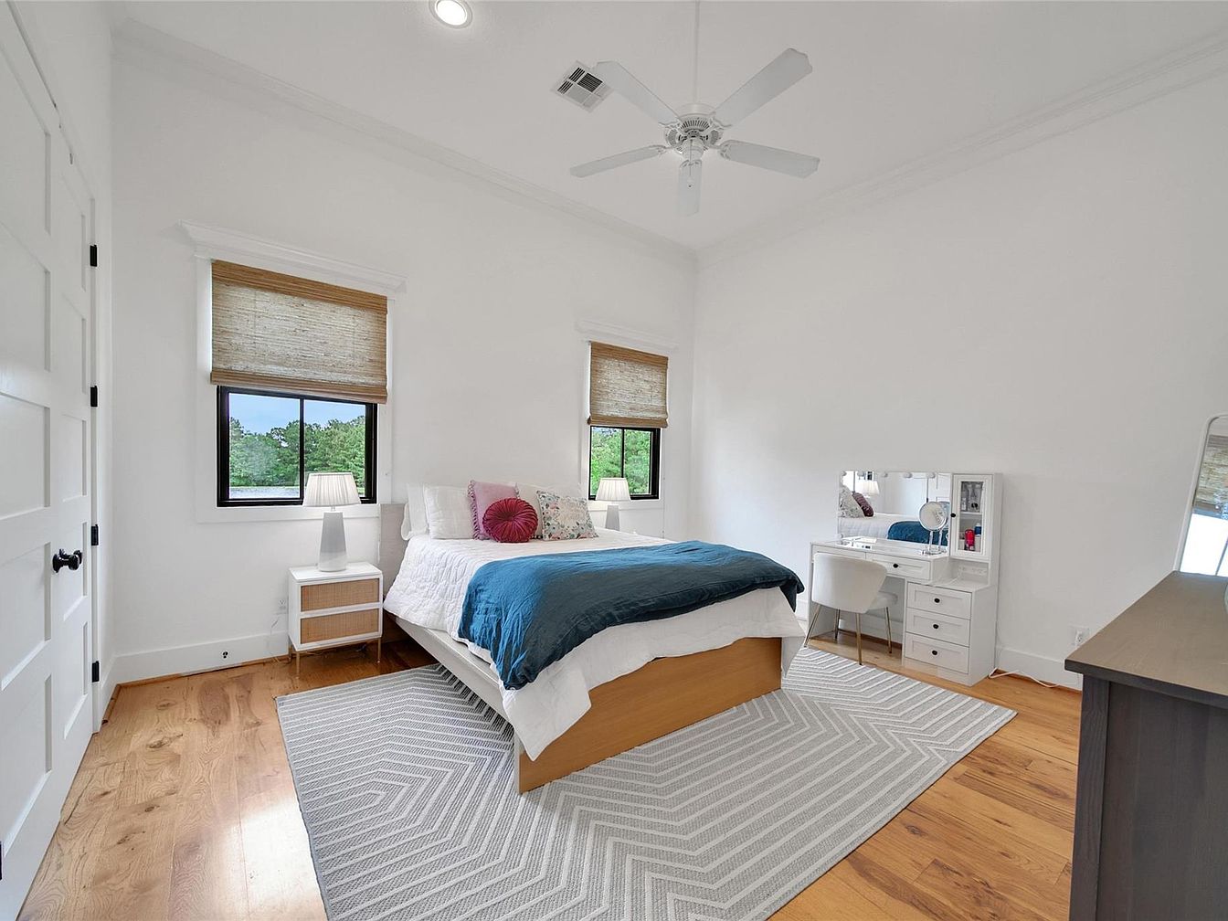 This bedroom features a serene, minimalist design with a light and airy feel. The walls and ceiling are painted crisp white, complementing the natural wood floors that add warmth to the space. Two windows with woven bamboo shades allow natural light to filter through gently. The bed, centered against the far wall, boasts white bedding accented by a deep teal throw and colorful pillows, injecting subtle vibrancy. On each side of the bed, matching white nightstands with modern lamps offer symmetry. A large textured area rug anchors the room, while a sleek white vanity with a mirror and cushioned chair provides functional elegance. A ceiling fan adds practical comfort, enhancing the room’s calm and inviting atmosphere.