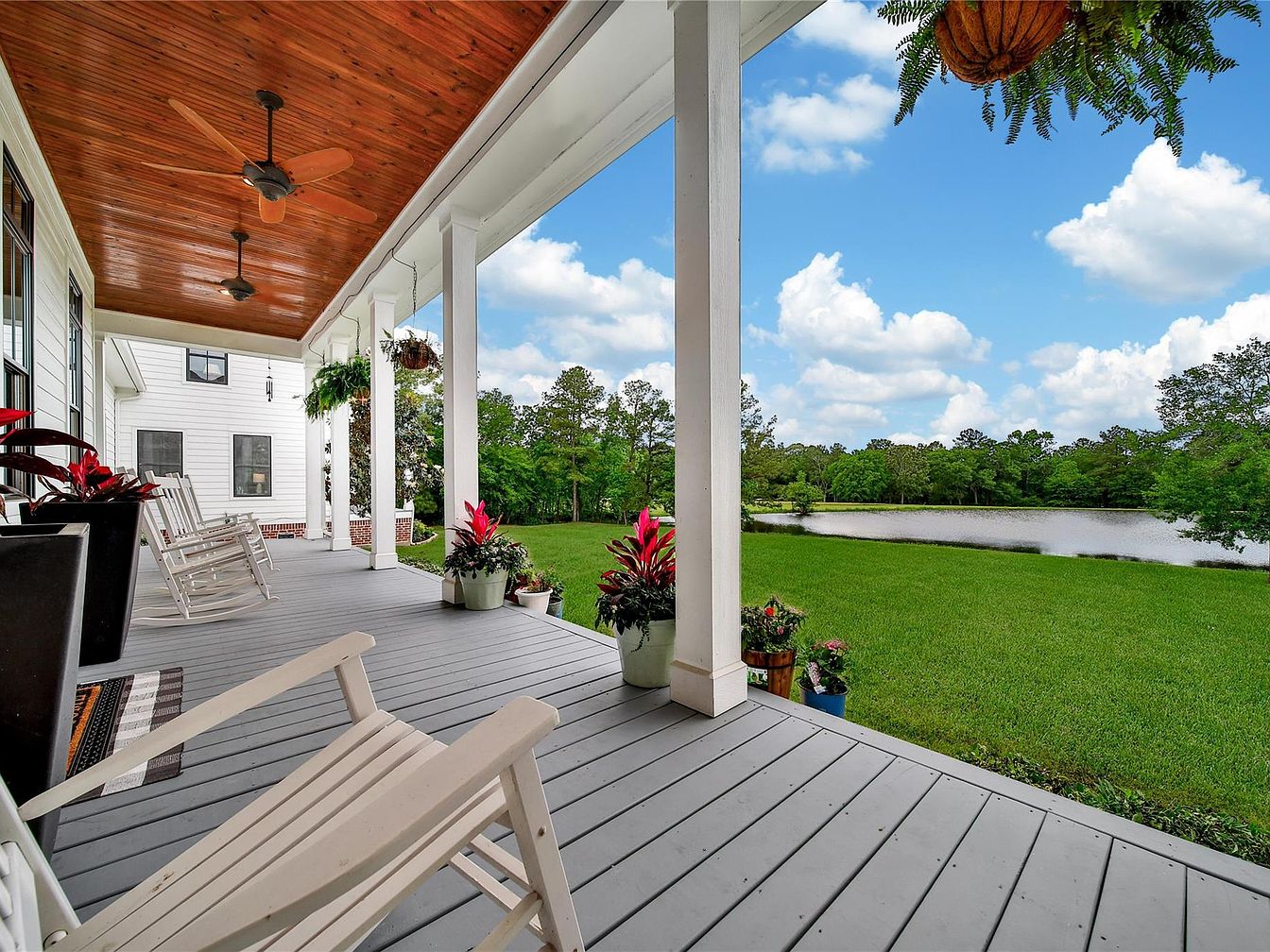 This inviting front porch is spacious and features a soothing color palette with light gray flooring, crisp white pillars, and house siding. The warm, rich wood ceiling adds depth and texture, complemented by two ceiling fans designed for comfort. White rocking chairs provide classic, cozy seating, ideal for relaxation or social gatherings. Several potted plants, including vibrant red-leafed foliage and hanging greenery, enhance the porch’s natural charm. The porch overlooks a lush green lawn leading to a tranquil pond surrounded by tall trees, creating a picturesque, peaceful outdoor retreat perfect for unwinding and enjoying nature.