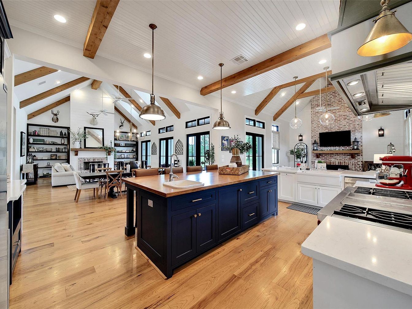 This expansive open-concept space combines a modern farmhouse kitchen with a cozy living area. The kitchen features a large island painted deep navy blue topped with warm wood, providing ample seating and workspace. Pendant lights with industrial finishes hang above the island, complementing exposed wooden ceiling beams that add rustic charm. The living area includes white shiplap walls, a brick fireplace with a wooden mantel, and black-framed windows and doors that bring in natural light. Neutral tones, wood accents, and black trim create a balanced blend of contemporary and farmhouse aesthetics, inviting warmth and sophistication.