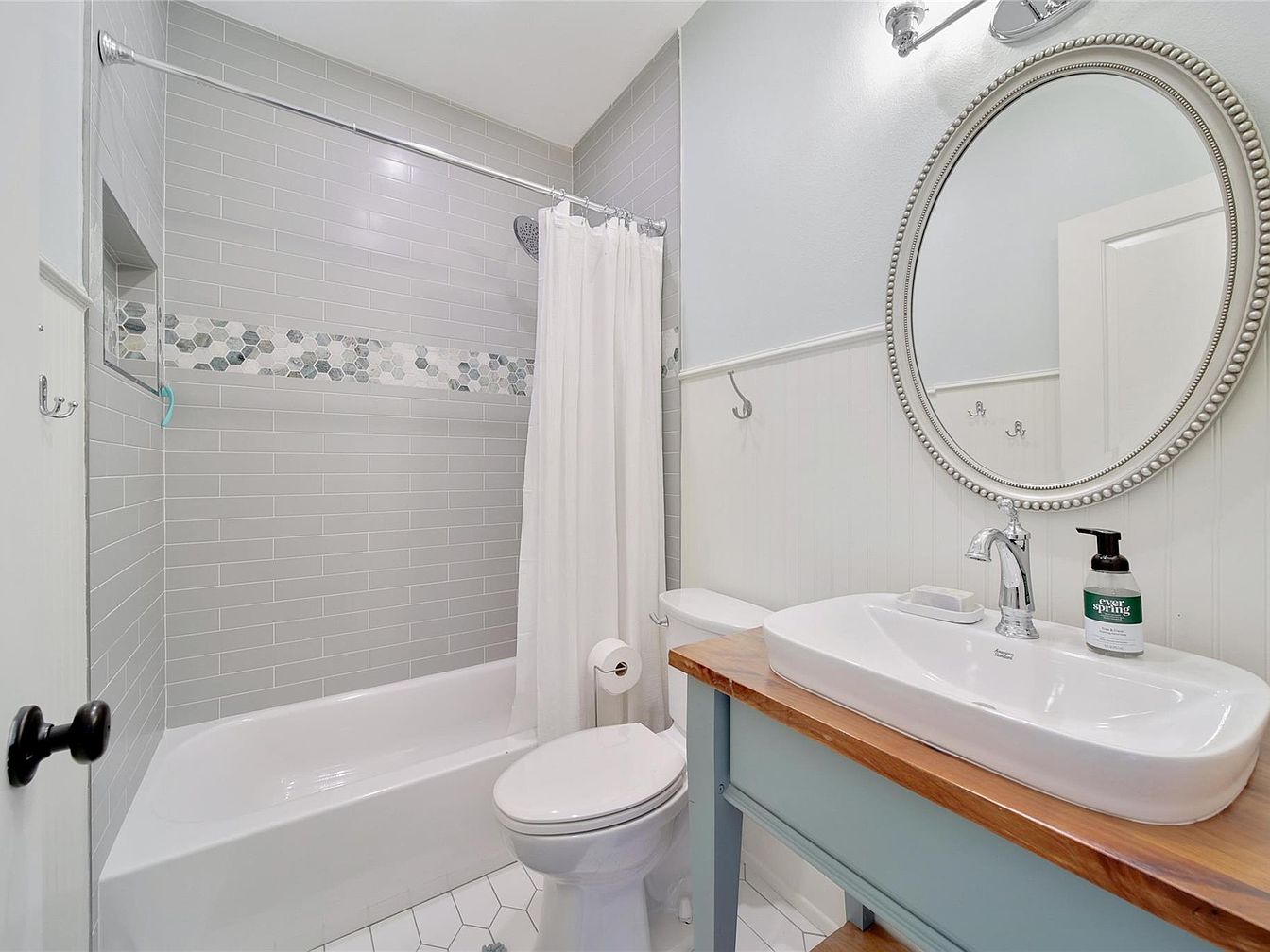 This bathroom features a compact layout blending function with subtle charm. A white bathtub with smooth curves is surrounded by light gray subway tiles, accented by a horizontal band of hexagonal mosaic tiles in varying muted shades, adding texture and interest. A simple white shower curtain presents a clean look. The vanity combines a wooden countertop with a pastel blue base, topped with an elongated, modern white vessel sink and a chrome faucet. Above it hangs a round mirror with an elegant beaded frame, enhancing the space’s soft, coastal-inspired aesthetics. White beadboard paneling on the wall adds depth and classic detail, contrasting with light gray paint above. Hexagonal white floor tiles unify the design, completing a fresh, airy feel.
