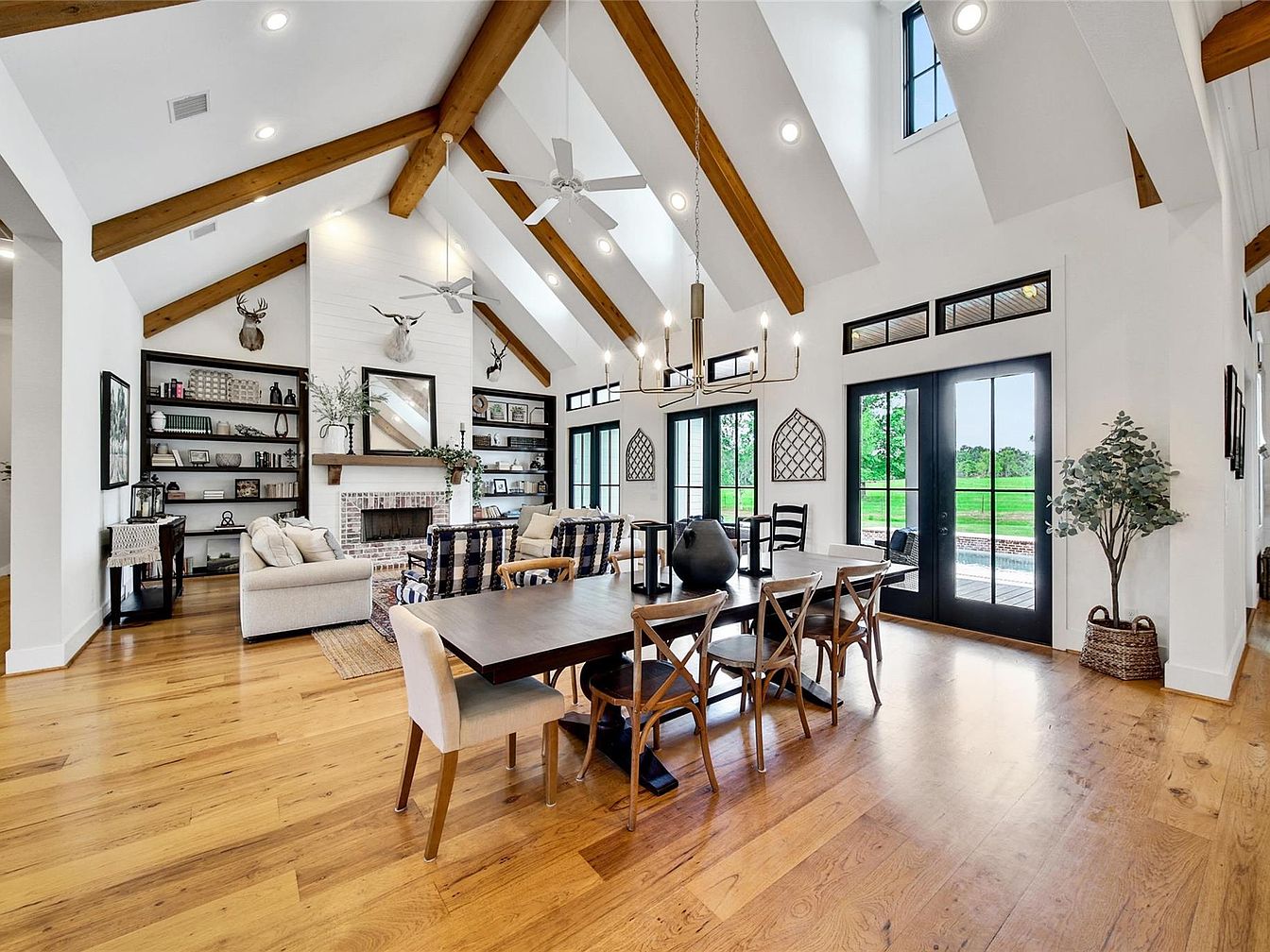 This expansive space combines the living and dining areas under a soaring vaulted ceiling with exposed wooden beams, creating a warm yet airy atmosphere. The light hardwood floors complement the white walls, enhancing brightness. Large black-framed glass French doors and high clerestory windows provide abundant natural light and scenic outdoor views. The dining area features a long wooden table with a mix of cross-back chairs and an upholstered chair, anchored by a modern, linear chandelier. The living area includes neutral-toned sofas and patterned armchairs arranged around a white shiplap fireplace with rustic brick detail and built-in shelving, accessorized with tasteful decor and mounted antlers, blending rustic charm with modern farmhouse style.